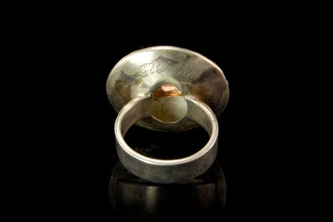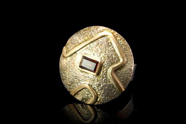This is a very beautiful and unique MODERN STYLE GARNET STERLING 14K GOLD ring size 5 (9.8g). The ring has a marvelous shape with garnet (5.5 x 3 mm), sterling and 14K gold decoration. The bottom has 14K STERLING and is signed. The ring has a very extravagant and elegant feel to it. The top measures 1". The ring is in very good condition.