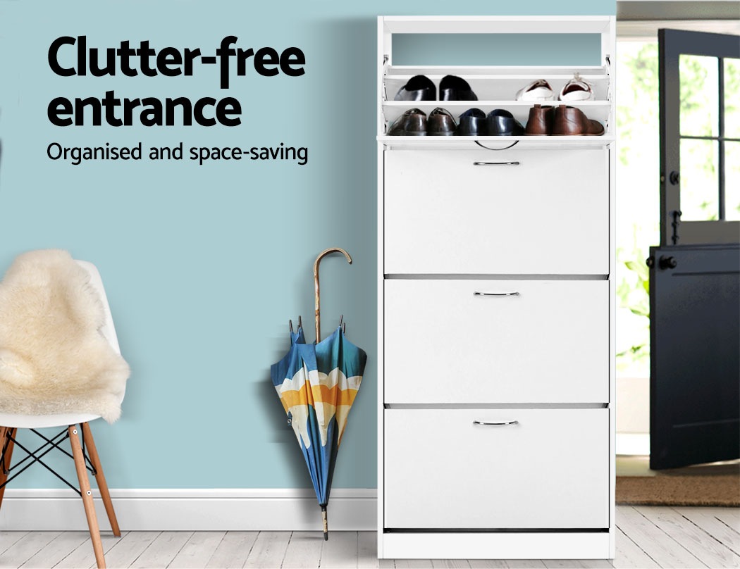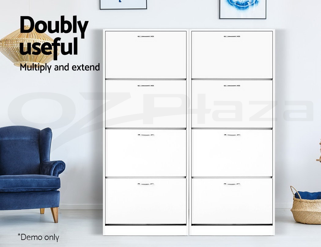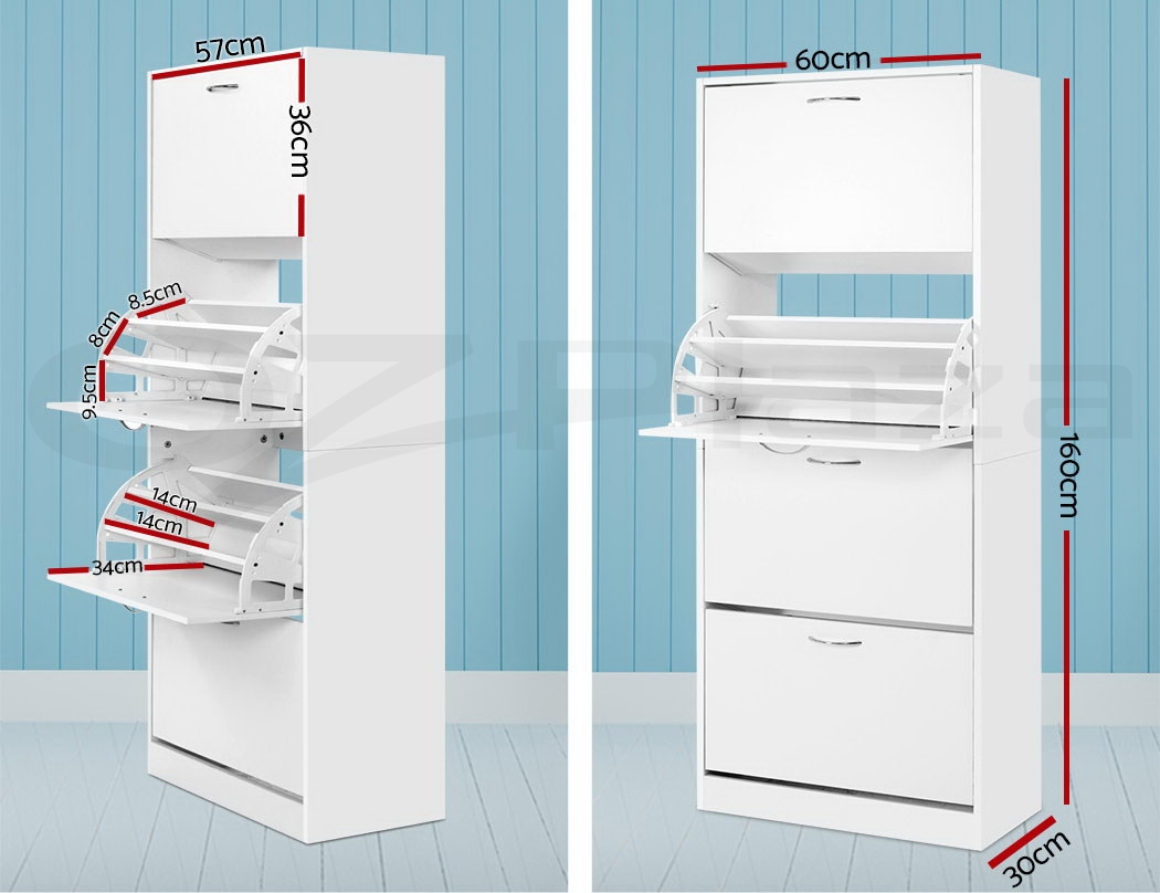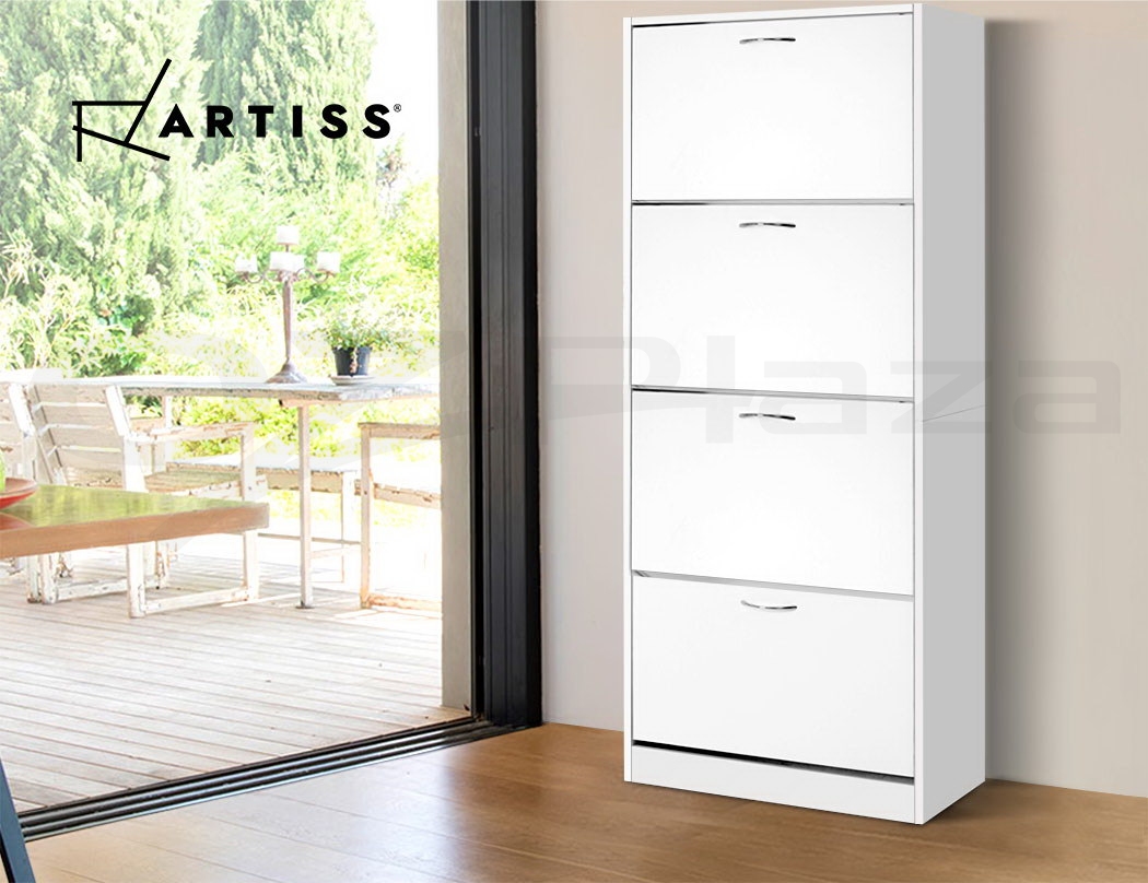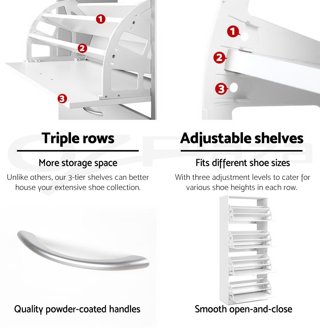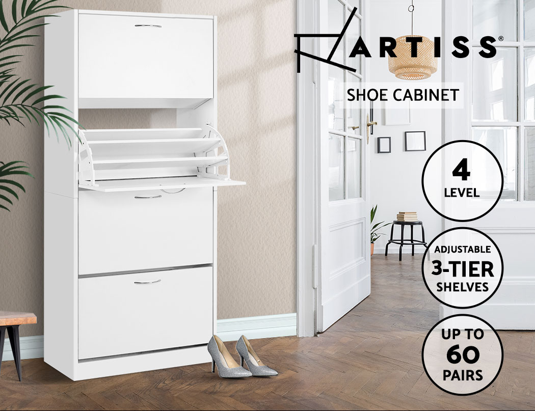 You are shoe proud. That is why you need ample space for all that wonderful footwear. Organise and save your floor space with our contemporary Artiss Shoe Cabinet and have a clutter-free entrance at all times. The four storage compartments are pull-down for easy access and have adjustable shelves so that they can fit different footwear of all shapes and sizes. In fact, up to 60 of your favourite pairs would fit comfortably in it. Made of thick particle board with melamine finish, the shoe cabinet is strong and durable to withstand daily robust use. Not least, the contemporary design with silver powder-coated handles definitely lends a touch of elegance to any home.