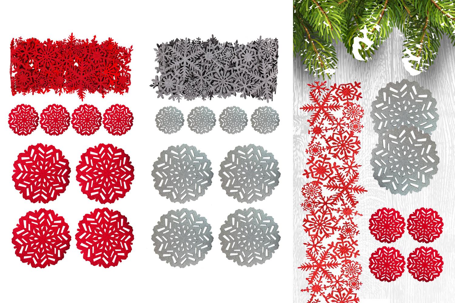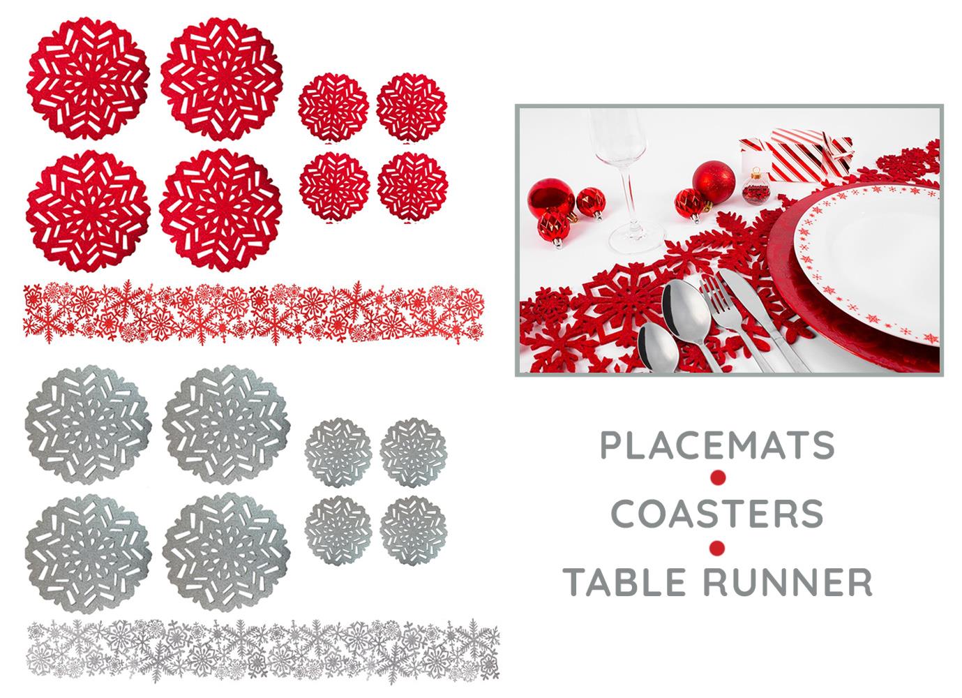 WHAT'S INCLUDED: The set includes 4 Placemats + 4 Coasters OR 4 Placemats + 4 Coasters + Table Runner in Silver or Red Glitter Snowflake design.