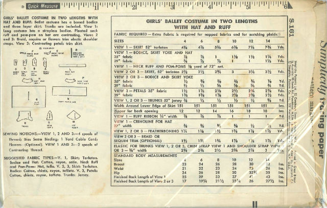 Vintage Ballet costume in Two Lengths, Hat & Ruff Sewing Pattern S161 Size 14 & 8