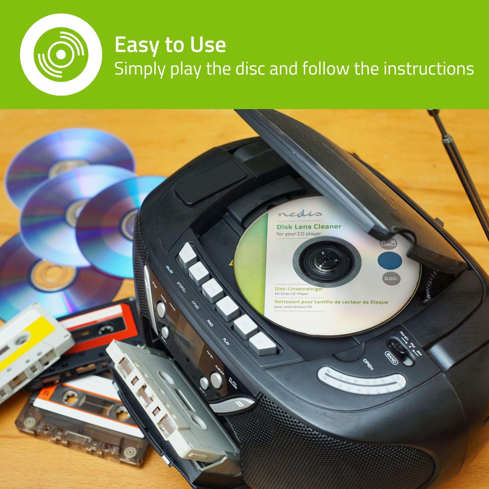 Lens cleaner kit to clean CD player lenses safely and easily. Apply a small amount of fluid to the brushes of the cleaning CD, insert the CD and press play to clean a CD player lens safely and easily.
