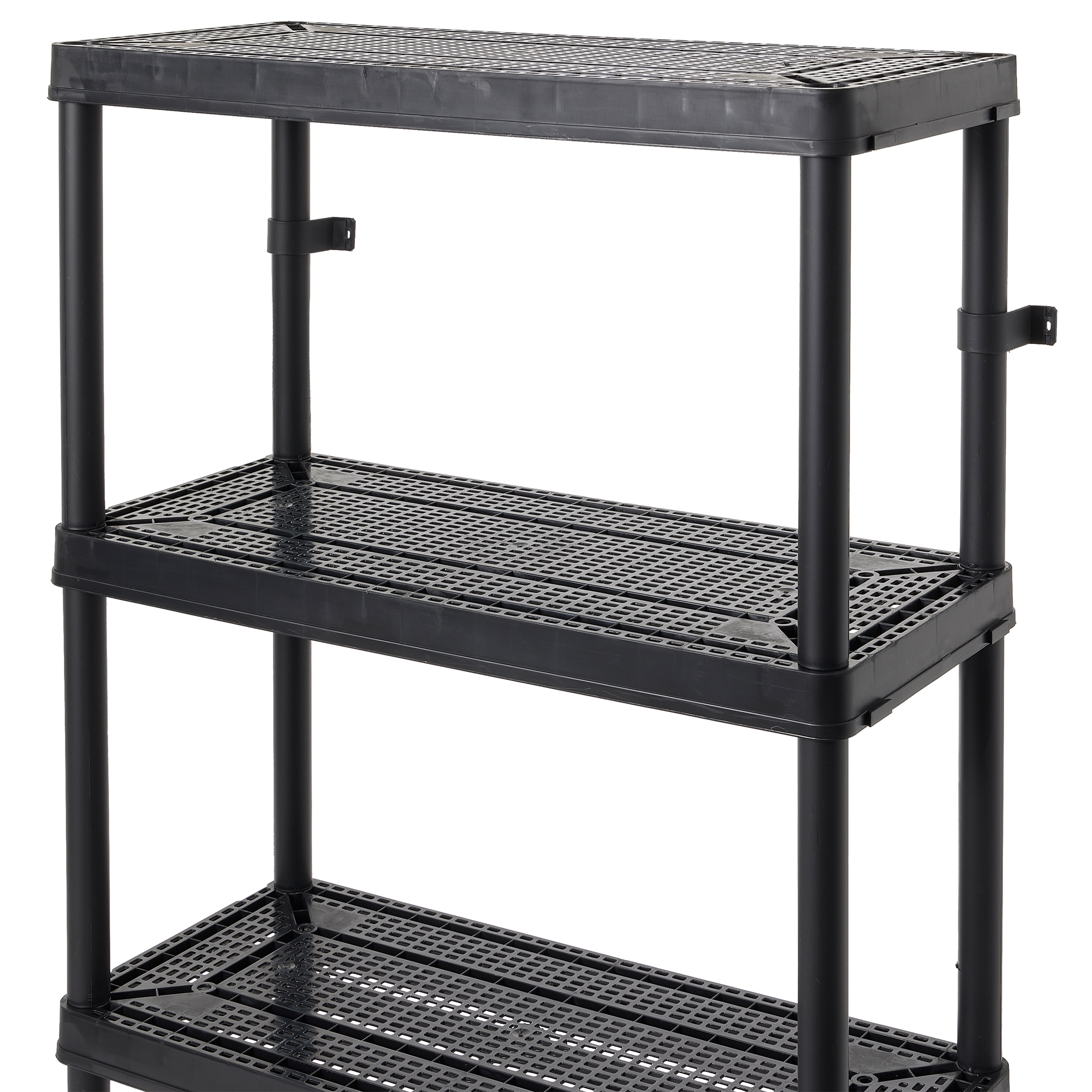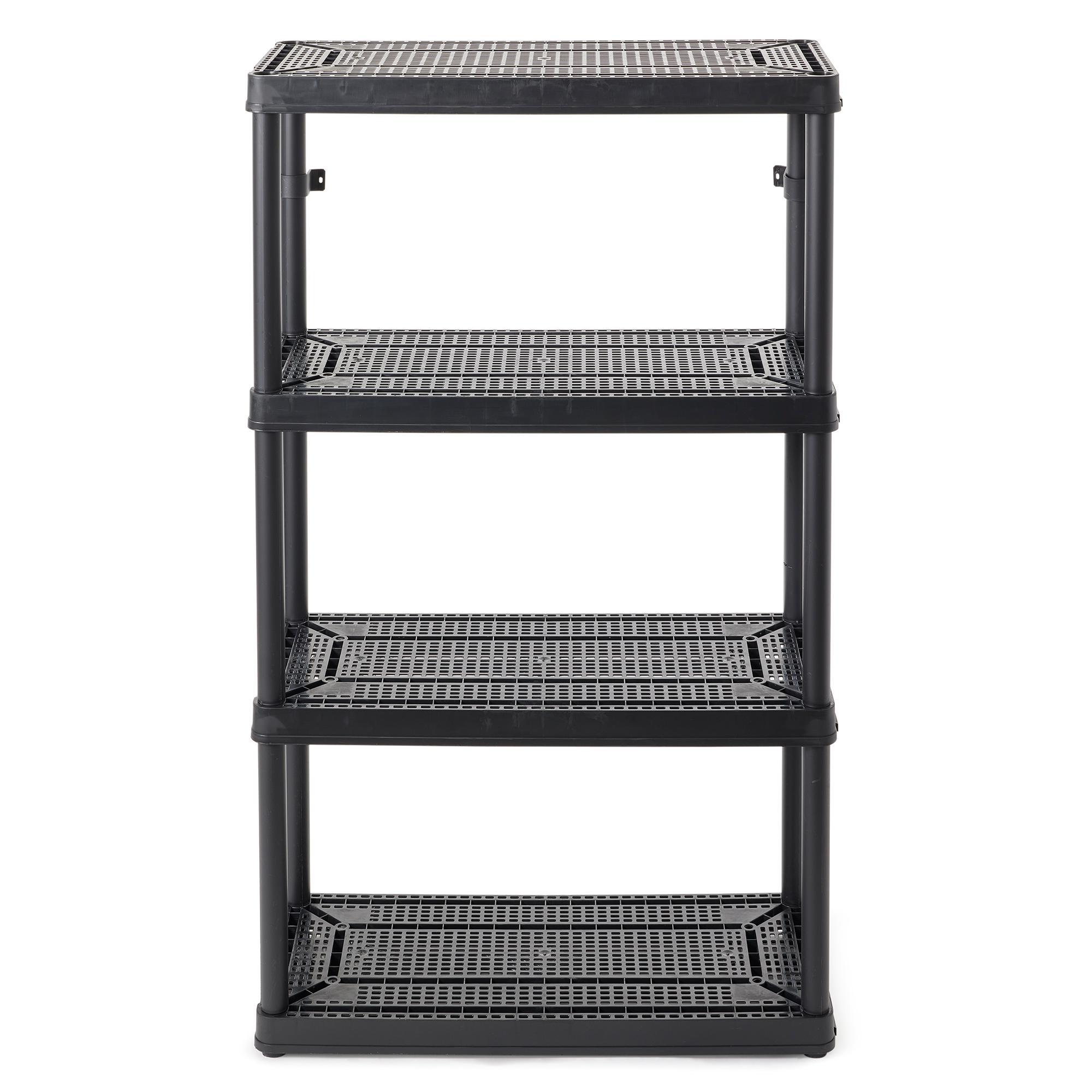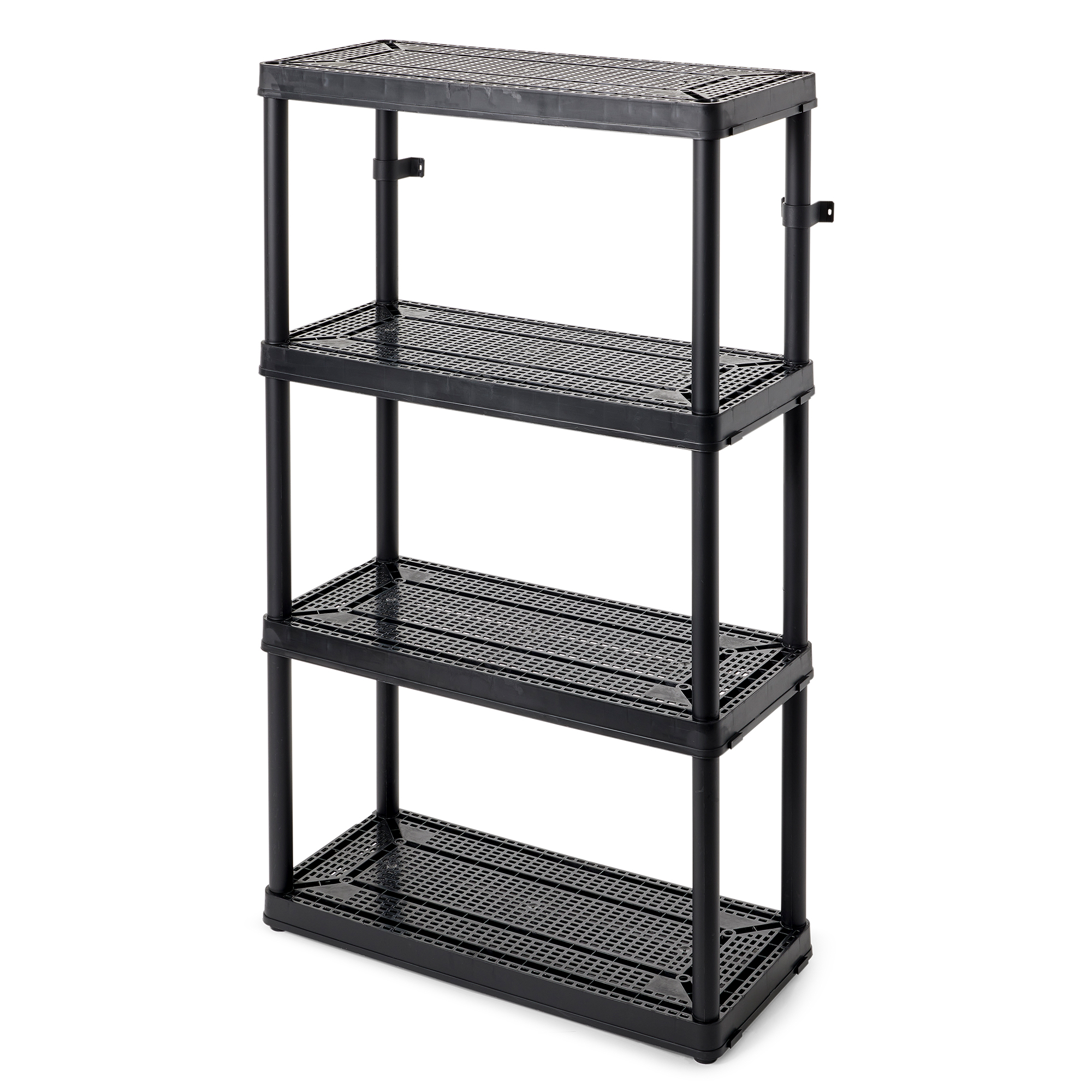 This bathroom storage shelf showcases timeless elegance for functional spaces with its lightweight, plastic construction and sleek color. Easily snap together for a simple installation process, and interconnect with additional units side-by-side for more storage space. Each ventilated shelf supports up to 100 pounds, providing a 400-pound unit capacity overall. Make sure that you distribute the weight evenly on the shelves for optimal, lasting use. With the 4 fixed shelves, you can organize laundry supplies, seasonal clothing items, home decor, toys, crafts, or tools. The closet storage shelf measures 32 inches long, 14 inches wide, and 54.5 inches tall offering a storage solution for any room. For added versatility, you can use the included brackets to mount the plastic shelves to the wall.