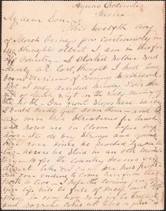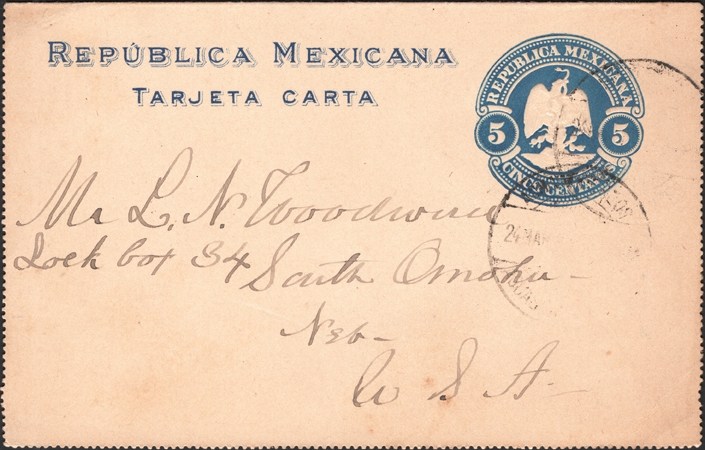 Mexico, 1900. Letter Card, H&G 18, mailed from Agua Calientes to South Omaha, Nebraska. Tied by light Aguascalientes cancel 24 Mar. Reverse with So. Omaha receiver Mar 28 1900. F-VF.