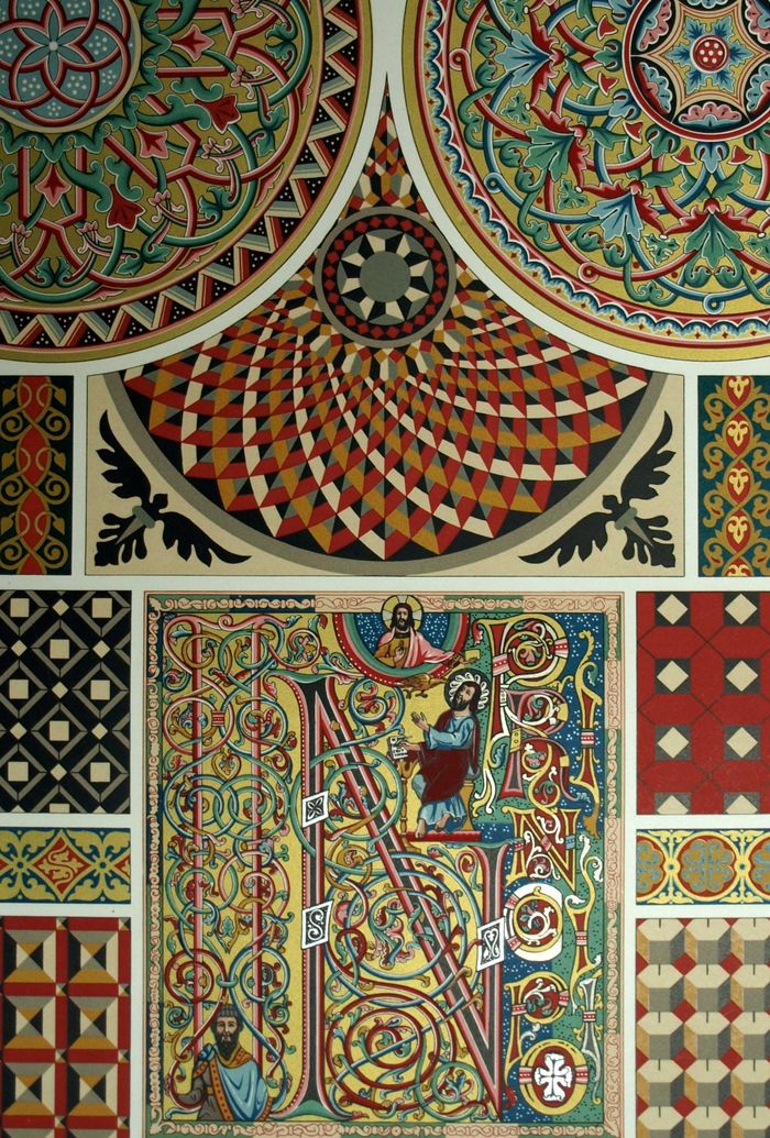Medieval Polychrome ornament Superb decorative chromolithography, from the end of the 19th century with golden ink. Leaf format: ~ 41 x 29 cm Drawing outlet, authentic print, 19th century. Light marginal freckles