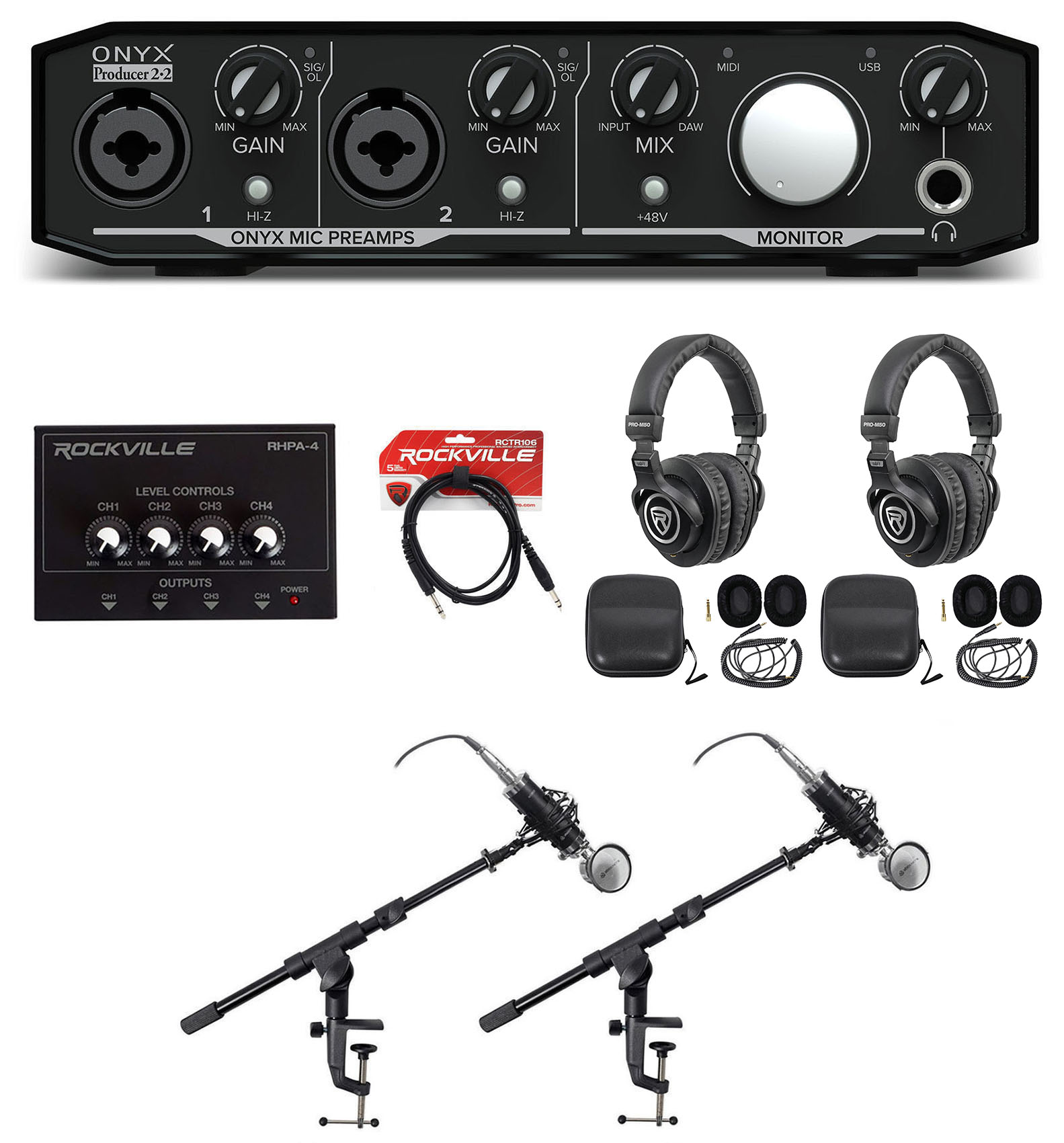Package: Mackie Onyx Producer 2.2 2x2 USB Audio MIDI Recording Studio Interface + Rockville RHPA4 4 Channel Professional Headphone Amplifier Stereo or Mono Amp + (2) Rockville RCM03 Pro Studio Recording Condenser Microphone Mic With High Quality Metal Construction and Shock Mount + (2) Rockville PRO-M50 Studio Headphones w/ Detachable Coil Cable, Case+Extra Ear Pad + (2) Samson MBA18 18" Studio Podcast USB Microphone Stand with Desk Clamp and Boom Arm + Rockville RCTR106B 6' 1/4'' TRS to 1/4'' TRS Balanced Cable, Black, 100% Copper