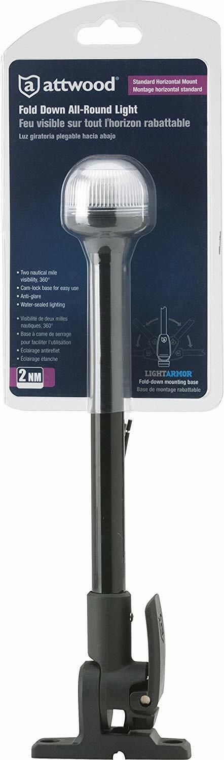 Whether at anchor or underway, it’s important your navigation lights are both functional and clearly visible to nearby boaters. Intelligently designed for easy installation, maintenance and efficient light output, this 12” folding all-round incandescent pole light provides 2 nautical mile range of visibility in a 360 degree radius to enhance safe navigation in any venue. Attwood Corporation has been an award-winning leader in engineering, testing, and manufacturing the highest quality marine products for over 100 years. We deliver safe and reliable lighting, fuel systems, water systems, seating & pedestals, swim ladders, custom upholstery, and general marine accessories that are easy to install and meet regulatory compliance.