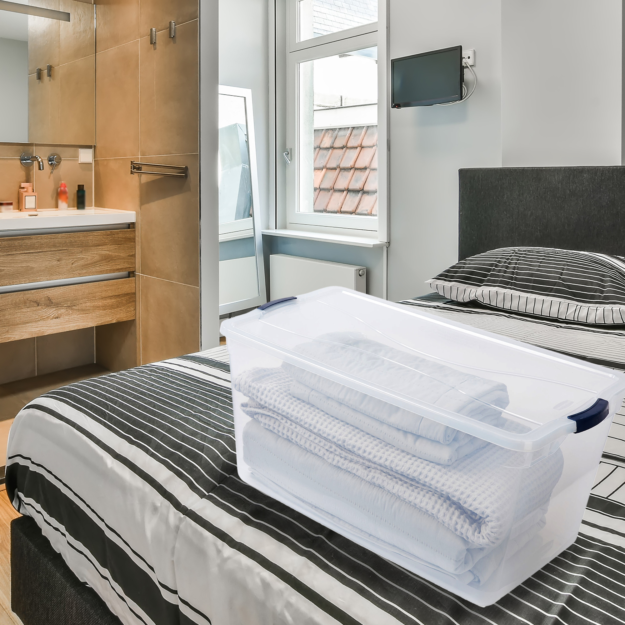 With a 95-quart capacity, this storage container is great for storing items like art supplies, kitchen spices, hats and gloves, seasonal clothing, toys, office supplies, holiday decorations, and more. This storage box's shape is ideal for use as a shoebox too. You can easily see what you stored inside the bin thanks to its clear sides and lid.
