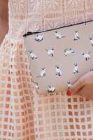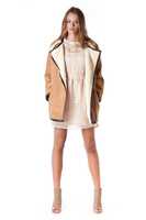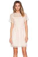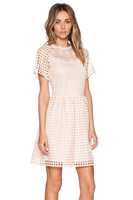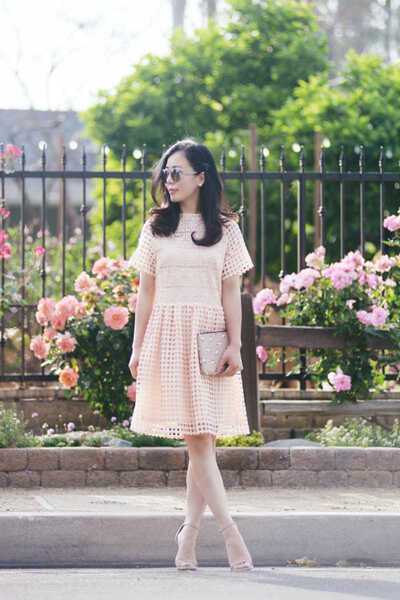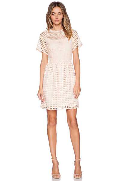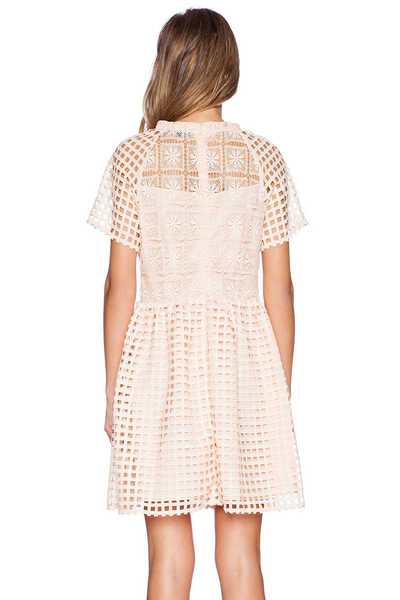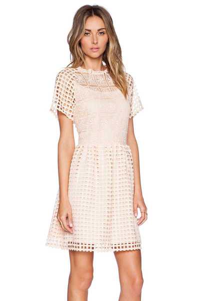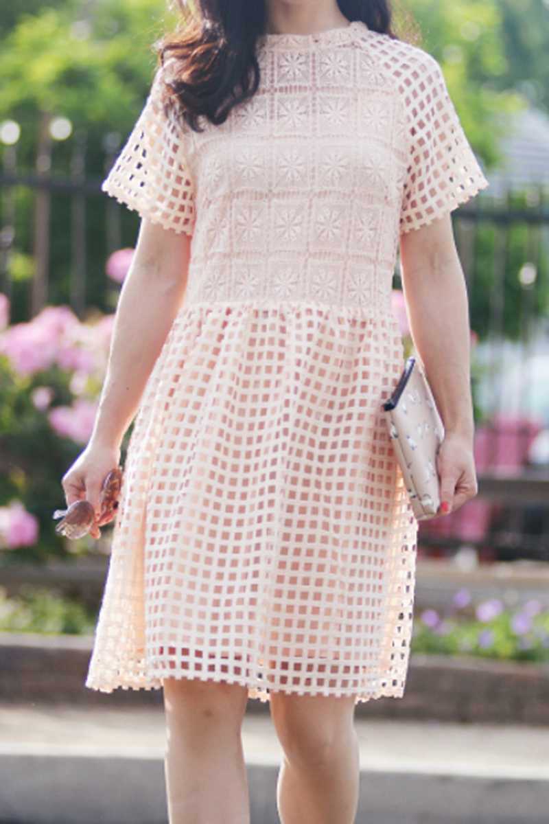 Short-sleeved peach fit and flare dress with crisp grid cutout sleeves and a grid cutout skirt. The bodice features geometric floral lace overlay on front and back with an invisible zipper down the middle. Inside slip has a scoop neckline, allowing for a sheer lace covering. Blogger favourite - as seen on Hallie of style blog Hallie Daily Connie of style blog Kisforkani