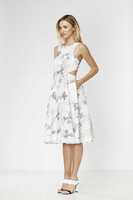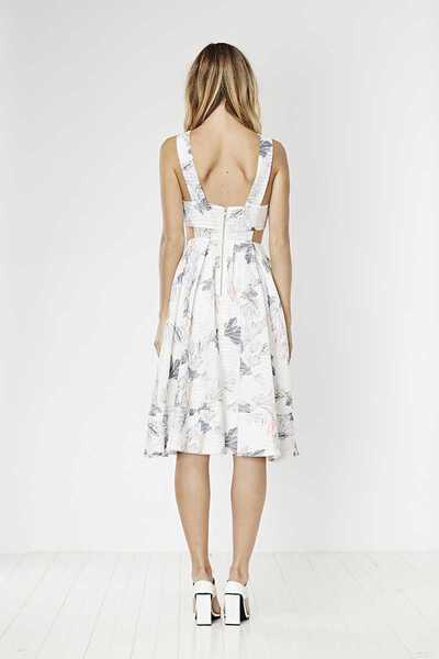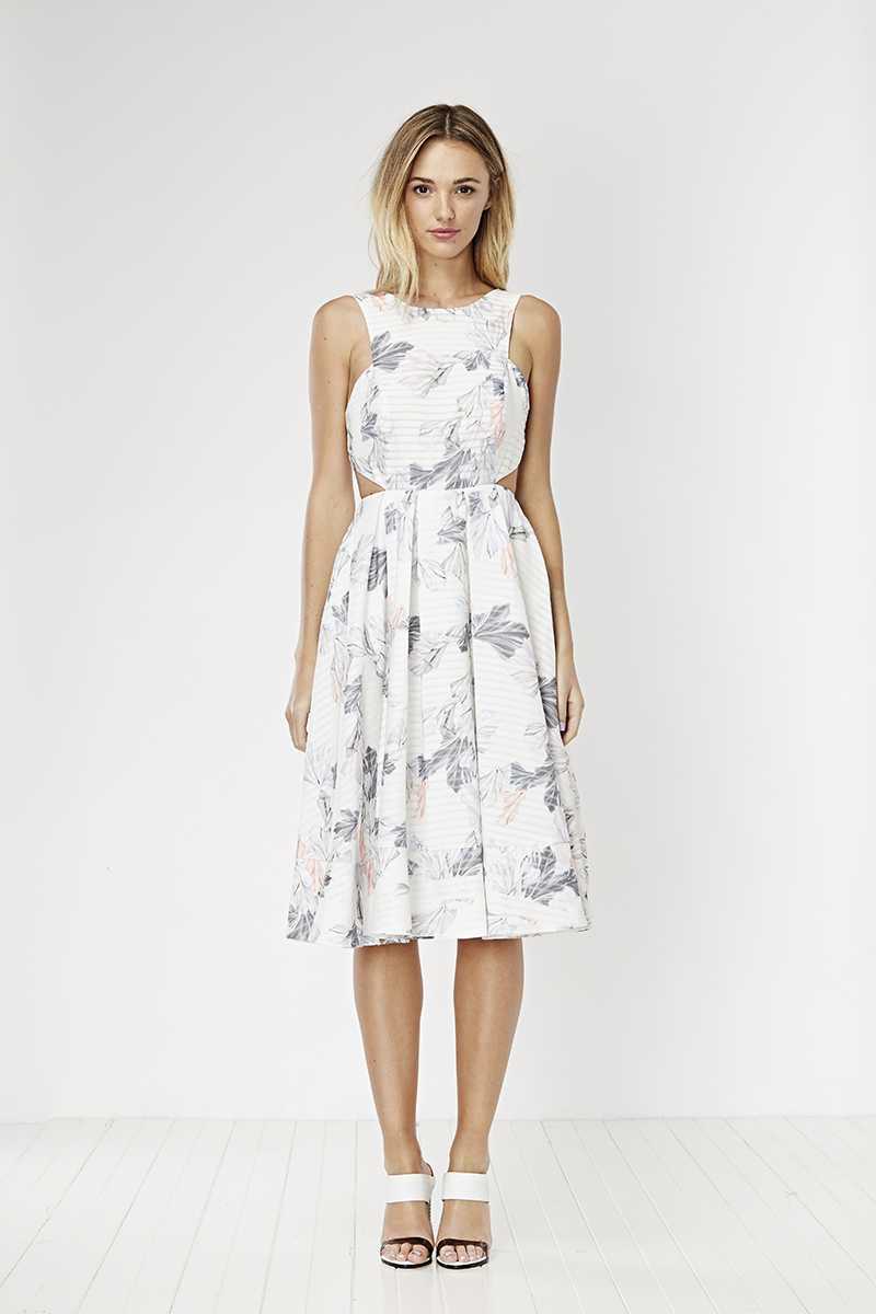 This beautiful midi party dress in exclusive Elle print features cut-out waist detail and pockets at hips. White base stripe with abstract print overlay. Perfect outfit for wedding or garden parties.