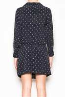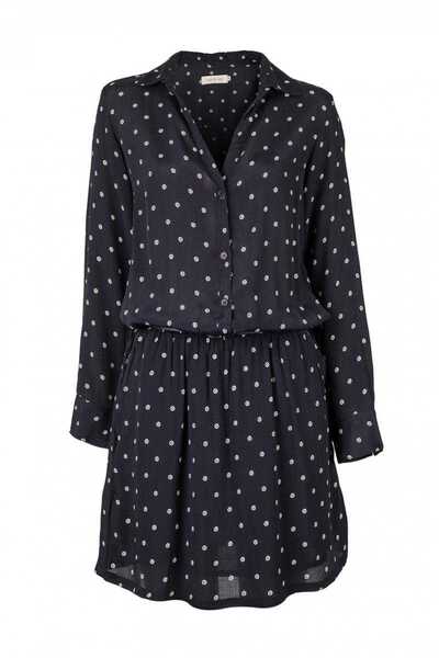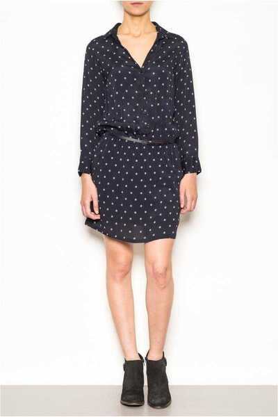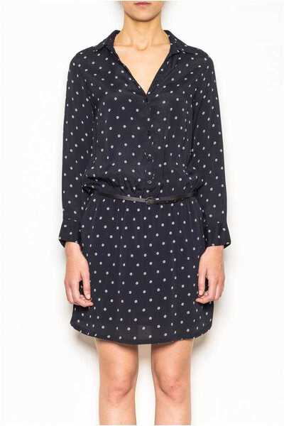 Indi and Cold long sleeve navy shirt dress in soft viscose. Beautiful shirt dress with long sleeves, neat collar and button front to the waist. The dress features a small all over circle print in white and comes with a lovely belt for a relaxed drape fit. Fantastic worn with a great pair of ankle boots. Belt included. Designed in Spain.