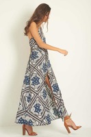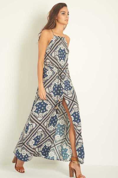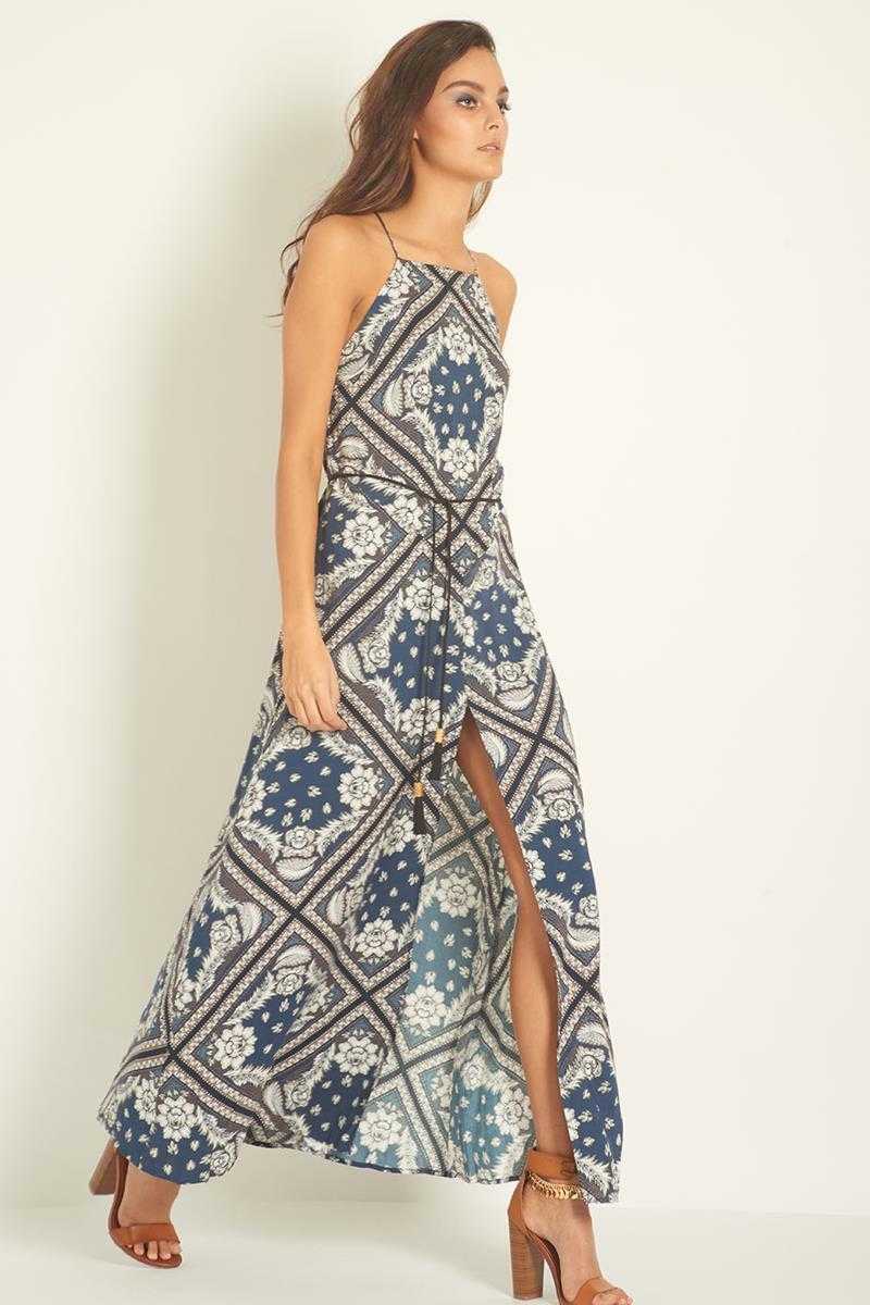 Maxi dress with thigh high splits and back crossed strap detailing featuring Three of Something exclusive Rock the Casbah print. Made from a printed light weight rayon. Designed in Australia. Blogger Favourite - as seen on Britney King (instagram user @britneyking)