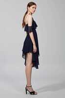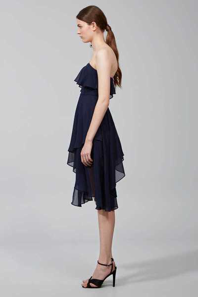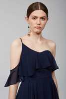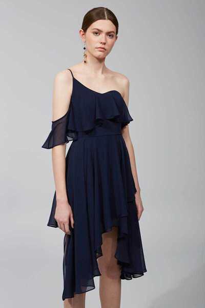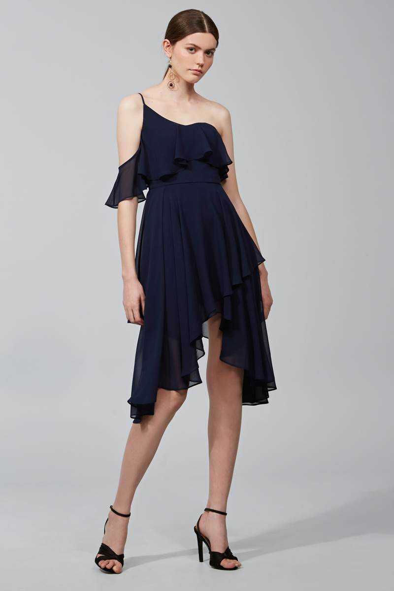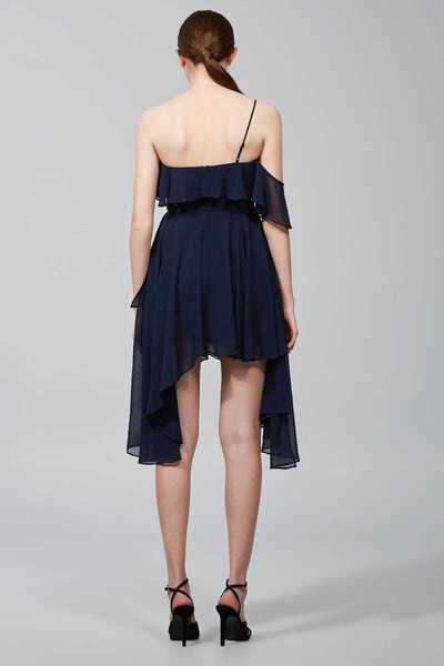 Keepsake Downtown Dress is a fit and flare style in a soft lightweight fabric. Features asymmetric neckline, thin adjustable strap and frilled bodice overlay with draped sleeve. Detailed with cinched in waist and layered floaty fit skirt with ruffles that fall softly to an asymmetrical hemline. Finished with invisible zip closure at back, boning and inner movement tape. Complete the look with a statement earring. Designed in Australia.