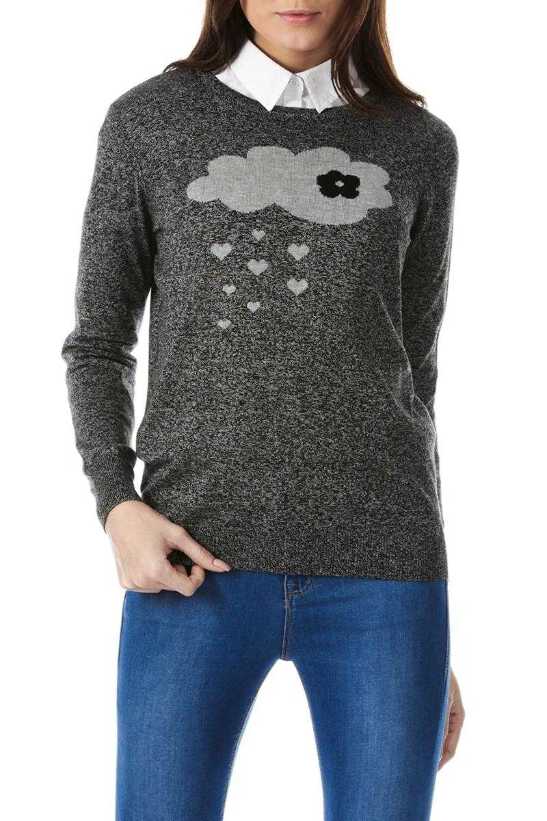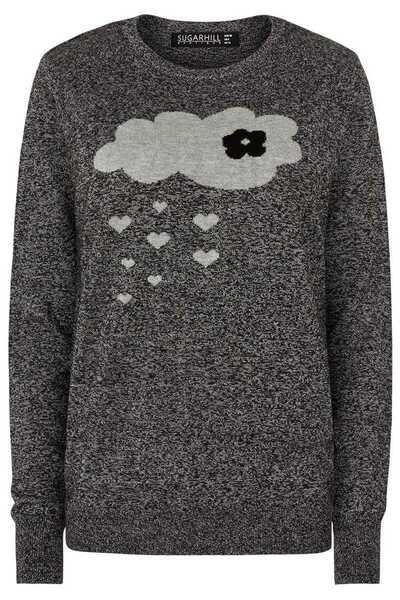 Spread a little love in this pretty raincloud sweater by Sugarhill Boutique! Featuring a raining hearts cloud intarsia design in gray marl on a dark gray lightweight sweater. Pair it with a white shirt for a smart casual Friday. Designed in UK.