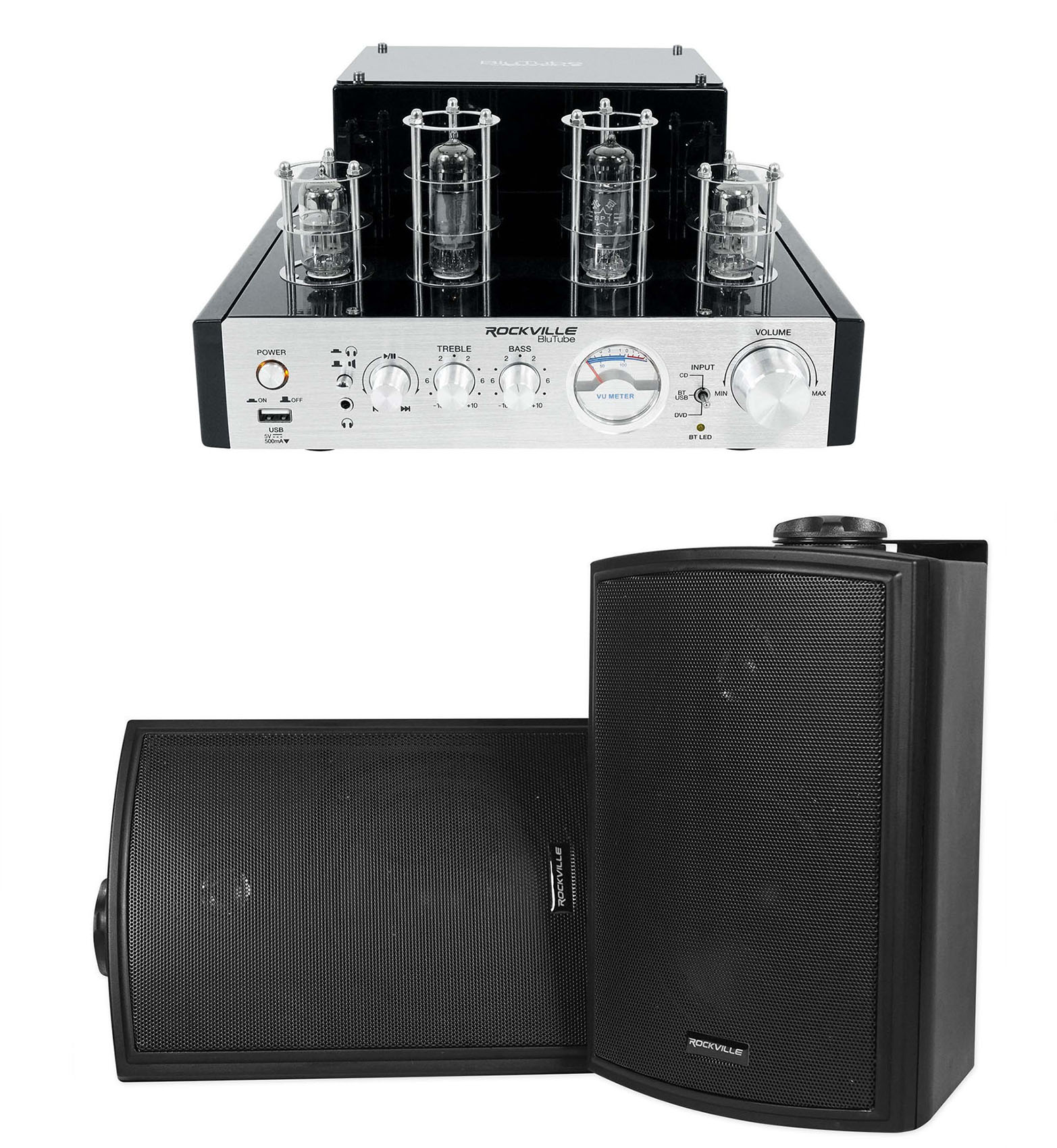 Package: Rockville BluTube Bluetooth Tube 70 Watt Amplifier/Home Theater Stereo Receiver + Pair of Rockville HP5S-8 BK 5.25" Outdoor/Indoor Swivel Home Theater Speakers in Black