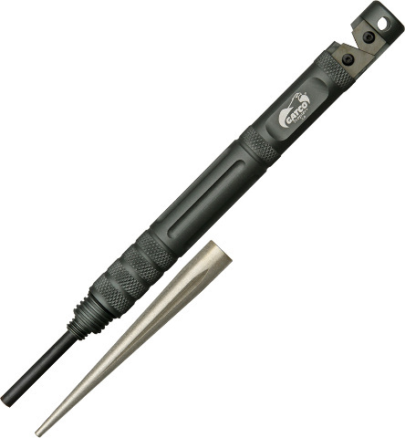 Gatco Scepter 2.0 Survival Tool/Knife Sharpener. 4 5/8" gray finish aluminum handle. Features tungsten carbide knife sharpener, diamond tapered serrations sharpener, fish hook sharpener and magnesium fire starter rod. Serration rod stores in handle. Ideal for hikers, bikers, campers, hunters, fishermen, police and military. Hang packaged.