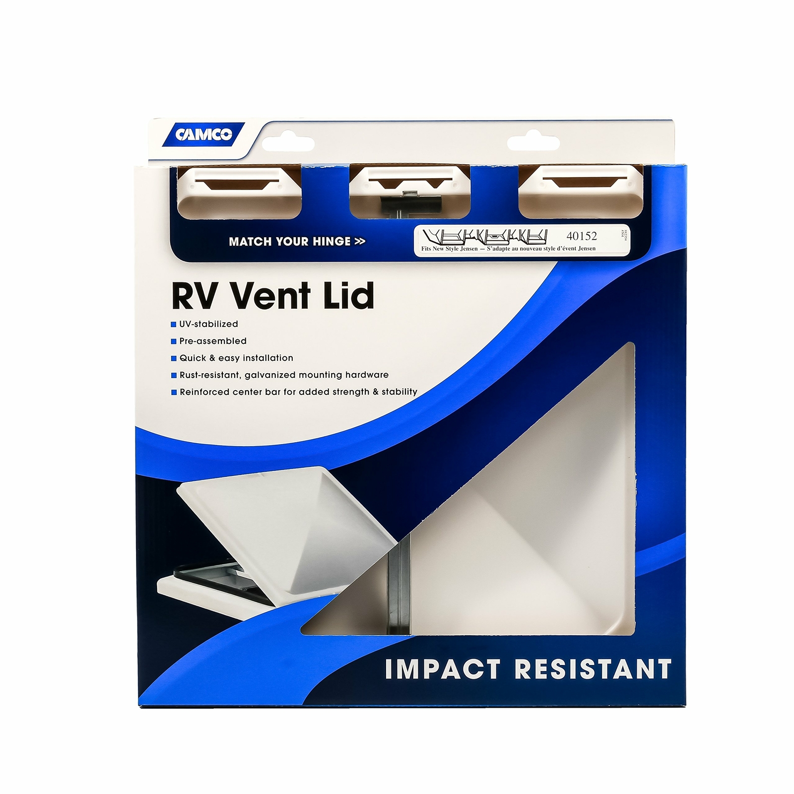 Camco RV White Polypropylene Replacement Vent Lid for New Jenson Metal Vent Lid, Jensen Metal Base for models '94 and up, is impact-resistant and comes preassembled. It includes all mounting hardware for quick, easy installation on all 14" x 14" RV vents. Hardware is rust resistant.