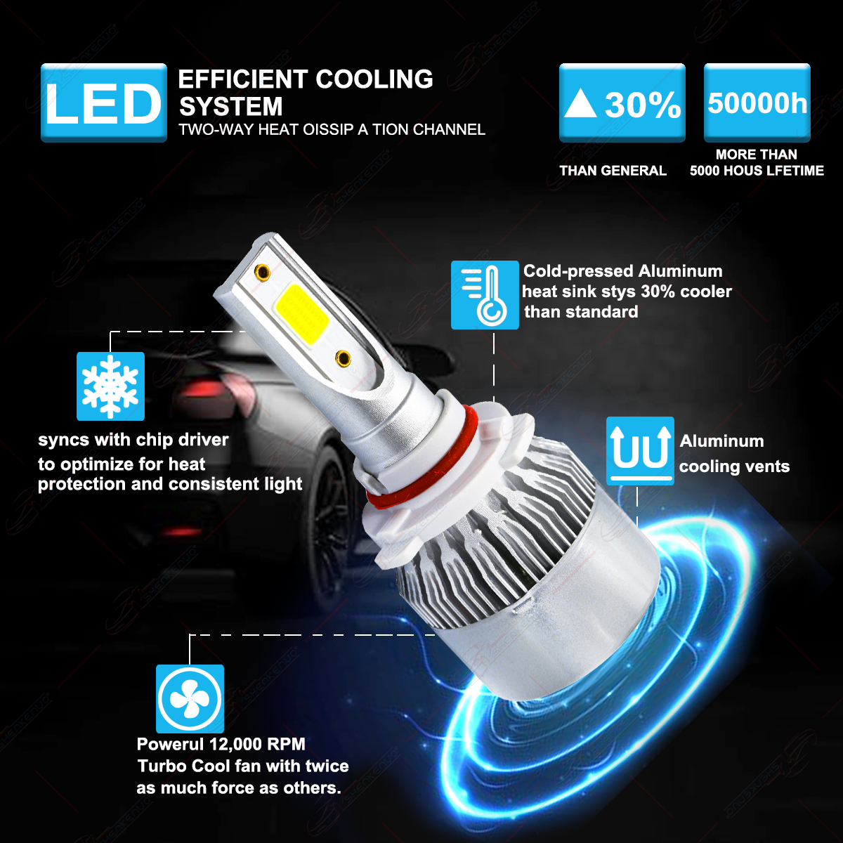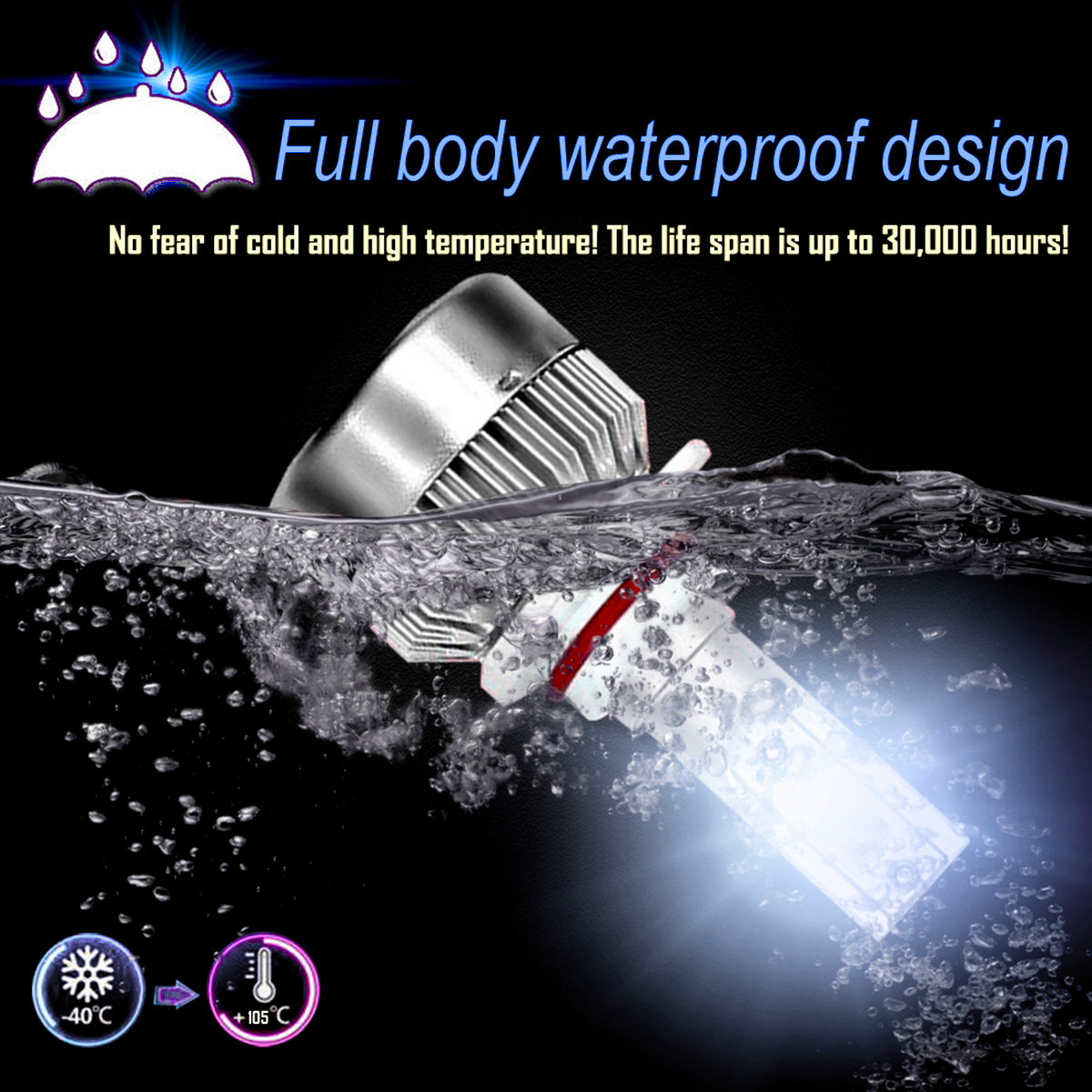 Each of this LED bulb equips at least 3 pieces premium quality large COB emitters for super bright HID comparable lighting output (10000 lumen/set). The industrial grade ultra thick full Aluminum housing and body provides better cooling and gives an excellent heat dissipation performance, which makes it possible for 50,000 hours life time. The 360 degree illumination design gives a wider range of lighting to reduce risk in the fog, snow and other bad weather situation.