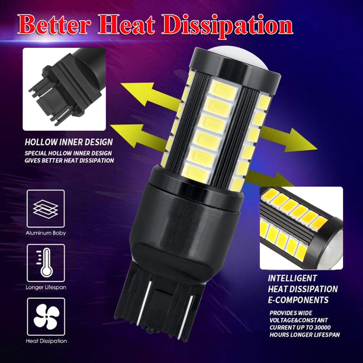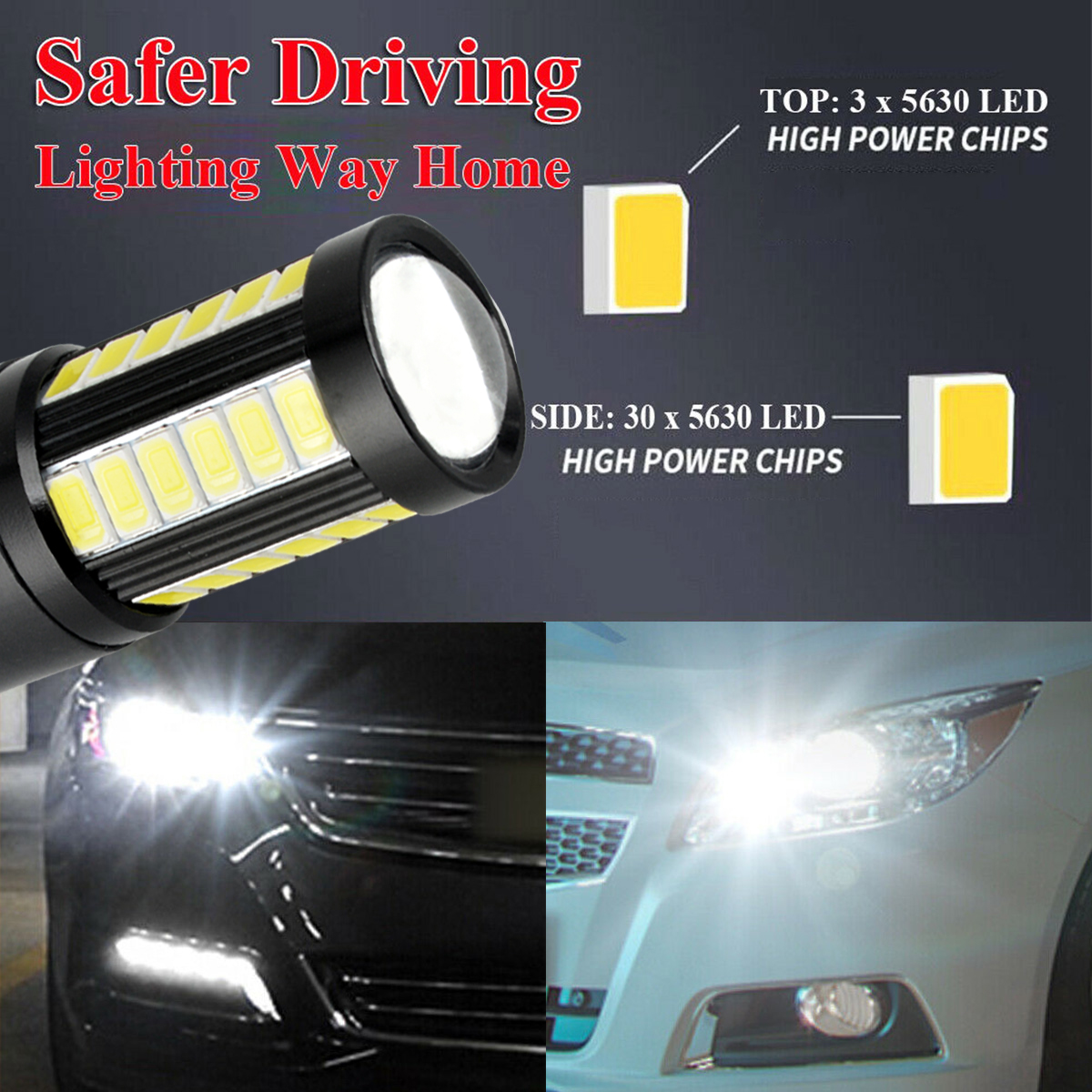 Each of this LED bulb equips 33 pieces High Power 5630 SMD type LED chips, 30 pieces on the side and 3 pieces on the top with magnify projector lens, which gives your car 360 degree lighting output!!