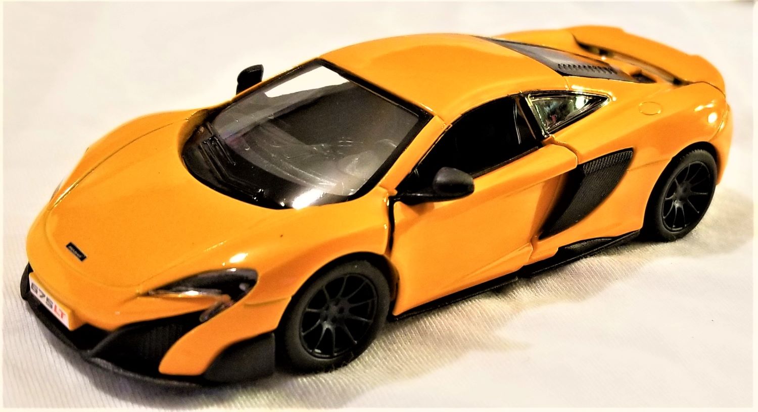 This is a Brand New Kinsmart - 1:36 Scale Model McLaren 675LT Orange. The model is about 5 inches long. This model comes with pull back & go and opening doors features. These models come in a big display box and they don't have individual boxes. They will be expertly packed and shipped.