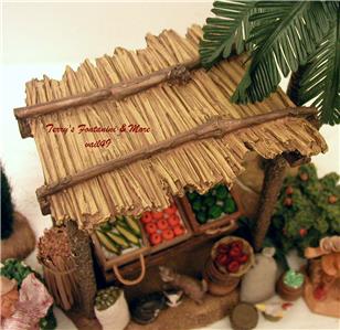 This Open-air Building is Entitled "The Vendor Kiosk". Measures 7.75"W x 6"D x 8"T. Made of Resin Material. Features a Primitive Thatched Roof Held up by 4 Poles. Roof had a 1" Section Broken off on Front Right. Was a Clean Break and the Piece was Easily Glued Back on. (See Pics of Roof).