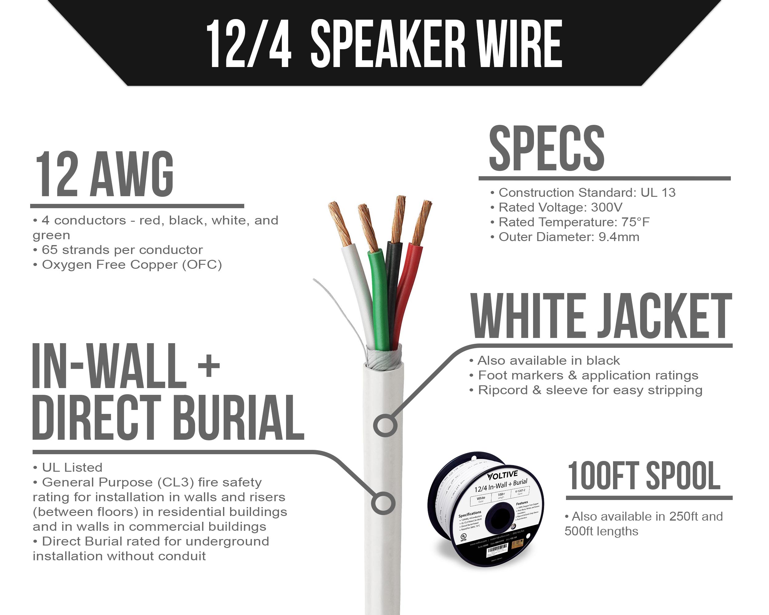 Voltive 12/4 Speaker Wire, In-Wall CL3 & Direct Burial, White, 100ft