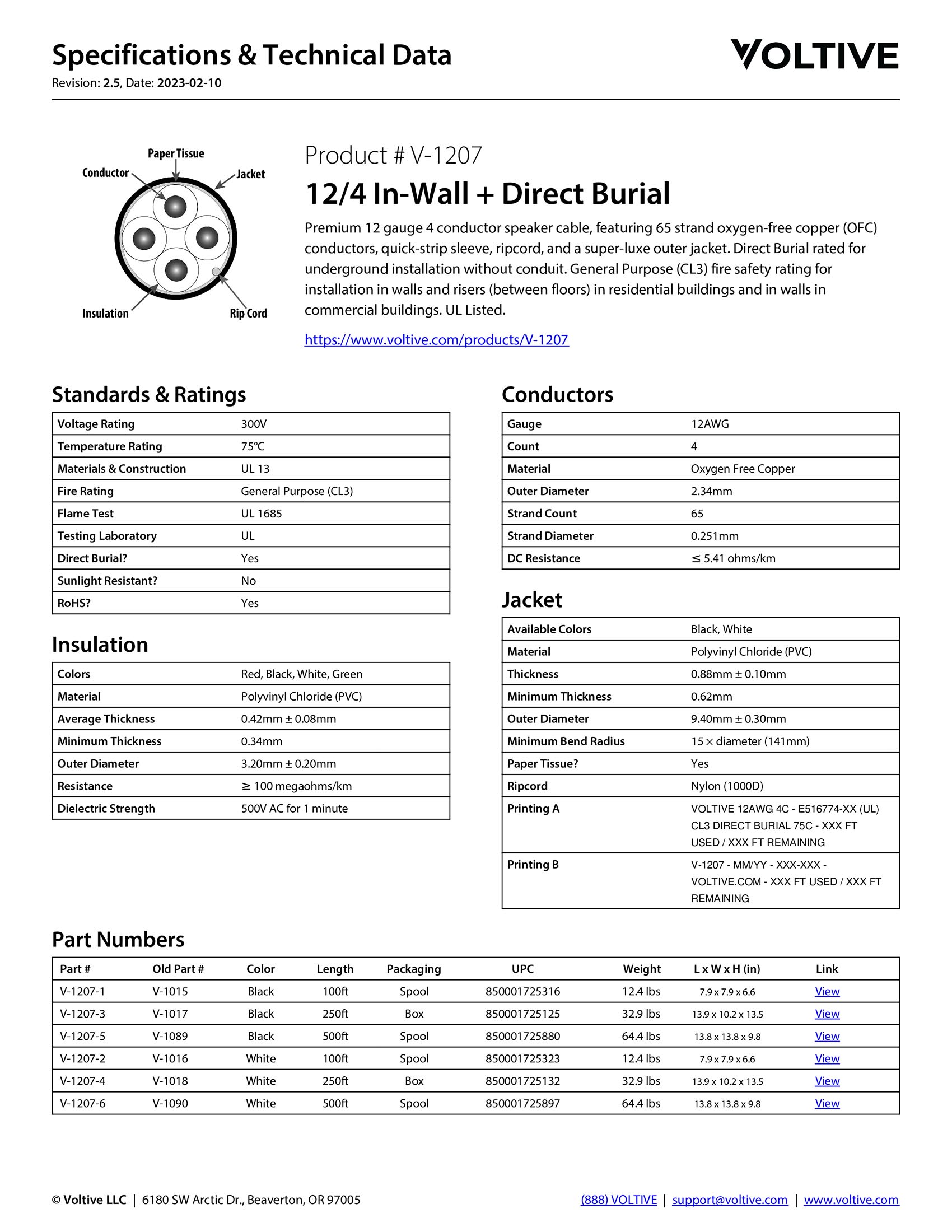 Voltive 12/4 Speaker Wire, In-Wall CL3 & Direct Burial, Black, 500ft