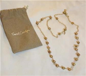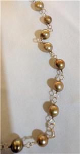 These necklaces by Florida artisan Sarah Carolyn (she has a boutique in Miami) usually come with an antique medallion at the midsection. This one doesn't. I purchased it at an estate sale so I don't know if someone removed the medal or if this is a piece done like the ones with the medallion less the medallion. There are 40" here to double into a two tier necklace...has a toggle closure and the pearls are linked with hand crafted gold toned chain. The pearls are simply gorgeous in a wonderful shade of gold...they are more numerous at the bottom of the necklace which looks so nice when being worn.