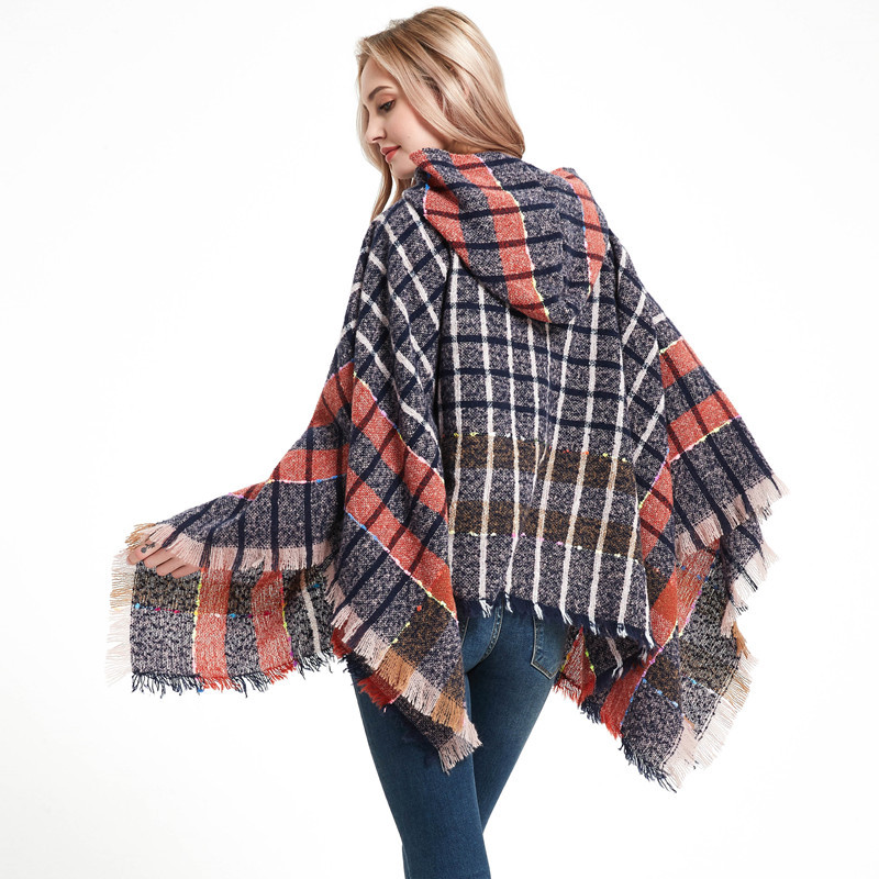Lady Cape Checked Knitted Poncho Blanket Wrap Shawl Hooded Tassel Sweater Warm