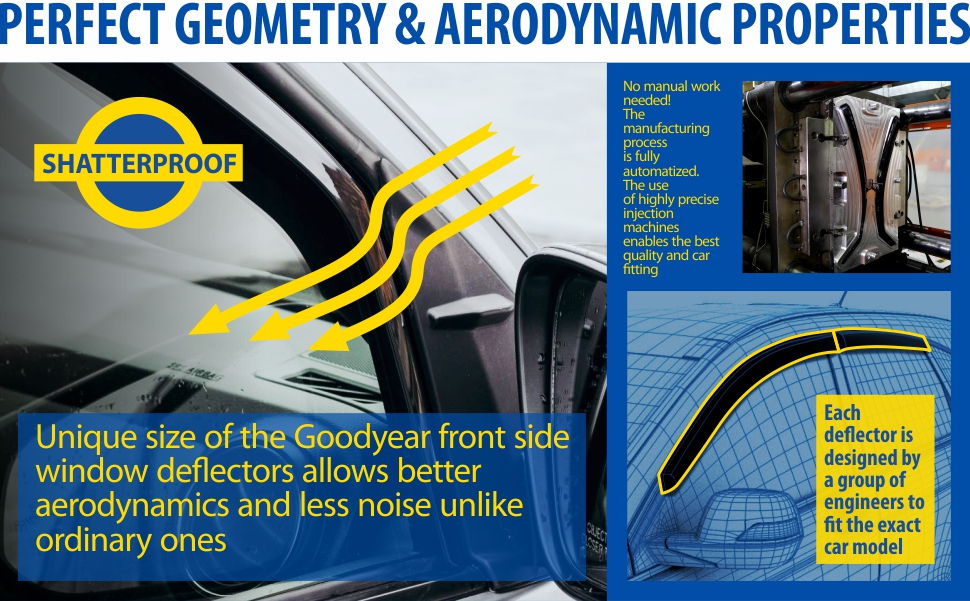 - PREMIUM GOODYEAR SIDE WINDOW DEFLECTORS let you roll your window down in rain, high winds, snow and ice. These window vent visors rain guards for cars keep you from getting wet while enjoying fresh air. Made of high quality, durable SHATTERPROOF material. Rain guard will not crack, break, or chip.