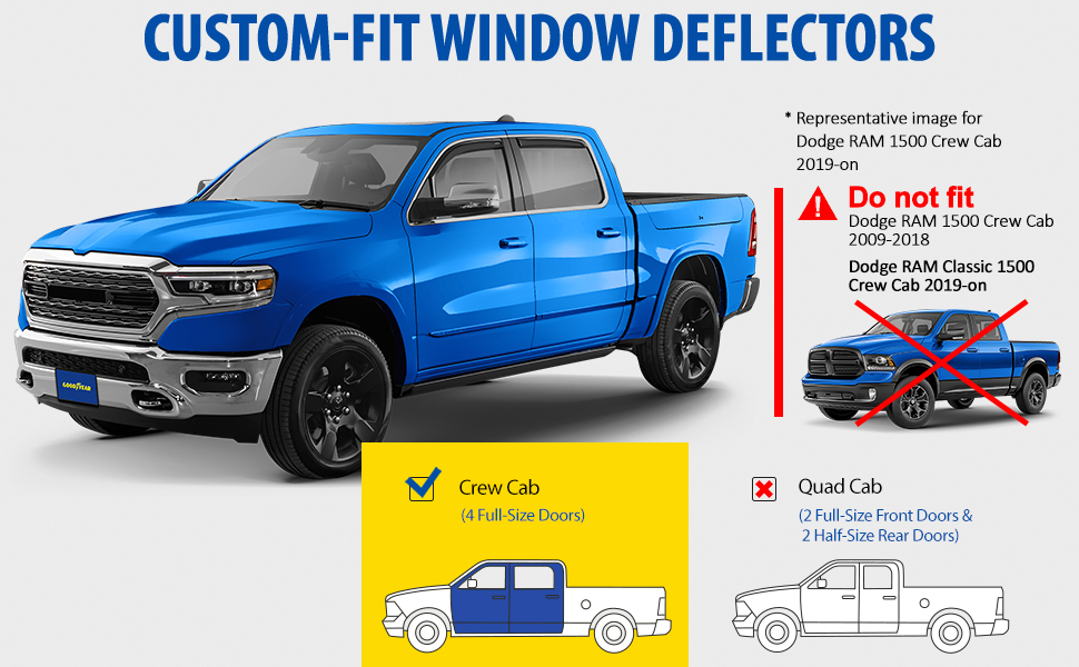 - Attention! Vent deflector CUSTOM FITS only for Dodge Ram 1500 2019-2026 Crew Cab (not fit for Dodge Ram Classic 2019-2026).