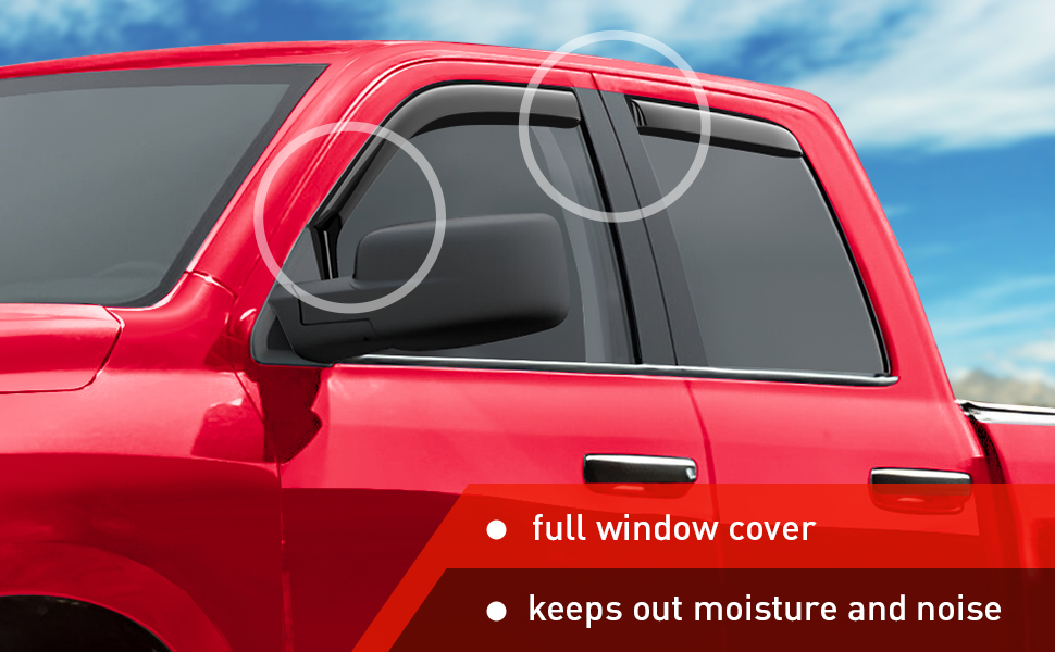 - Full-size Side Window Deflectors – This 4-piece set includes passenger and driver side rain guards that create a seamless look that protects you from sun rays, rain drops, and wind while you’re driving with the window down.