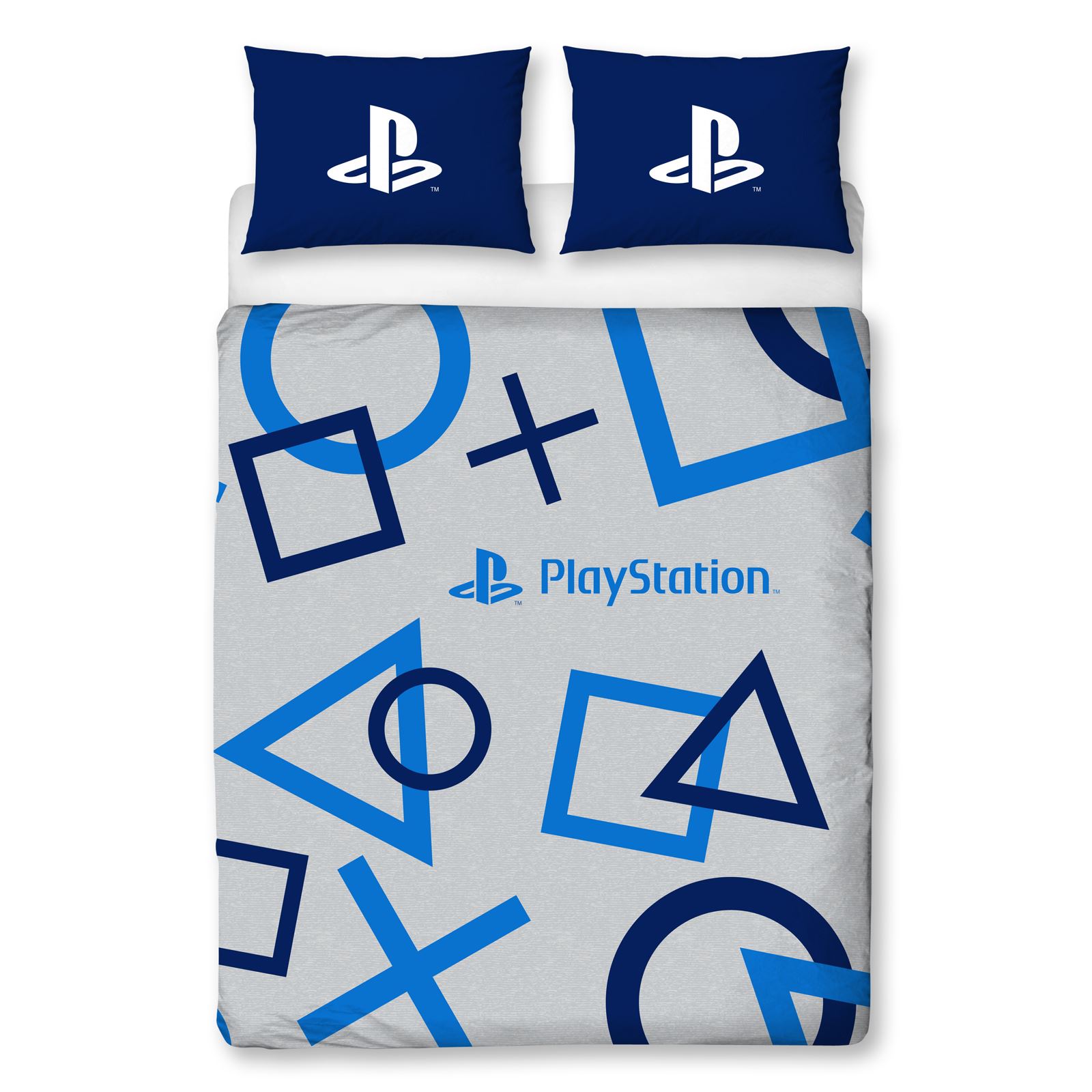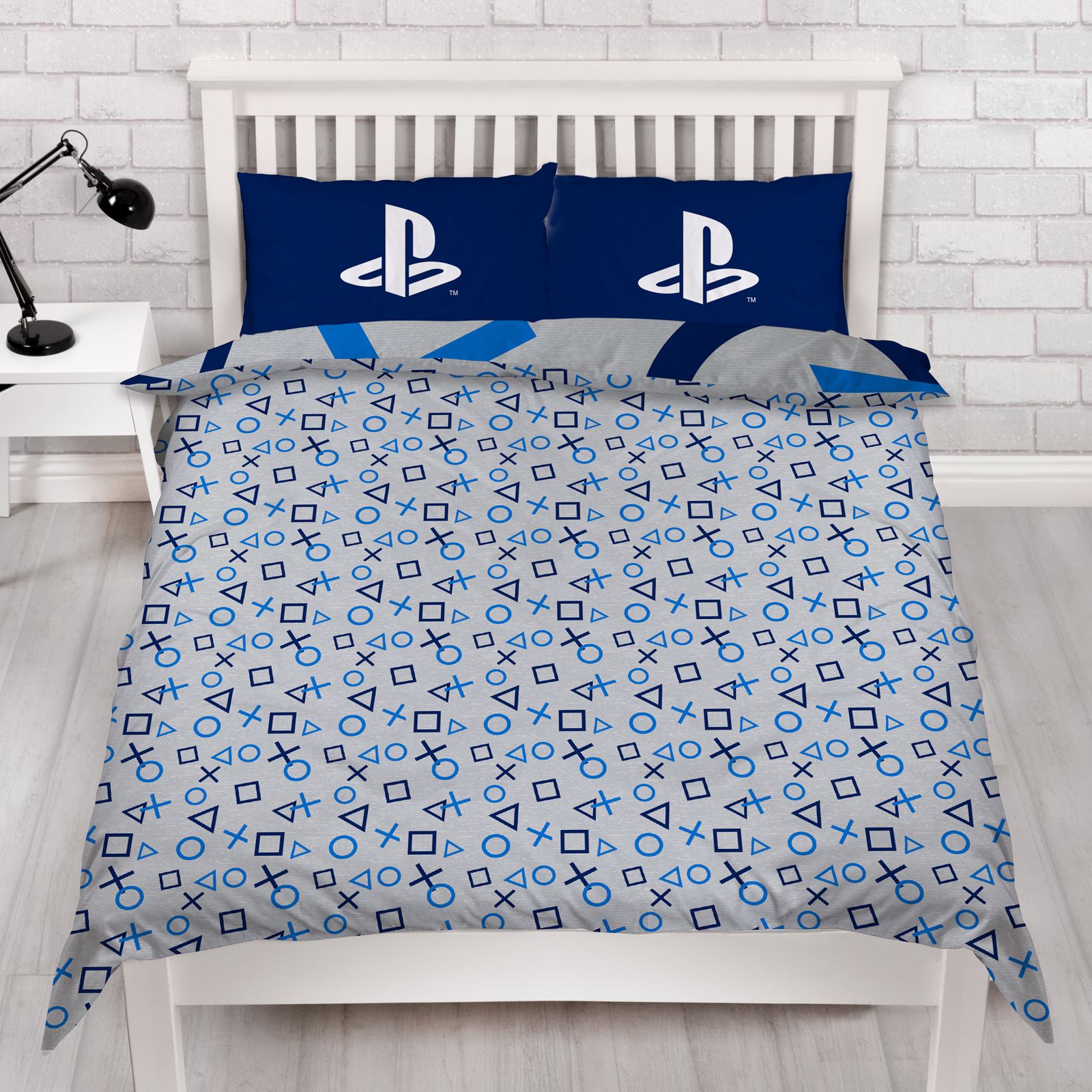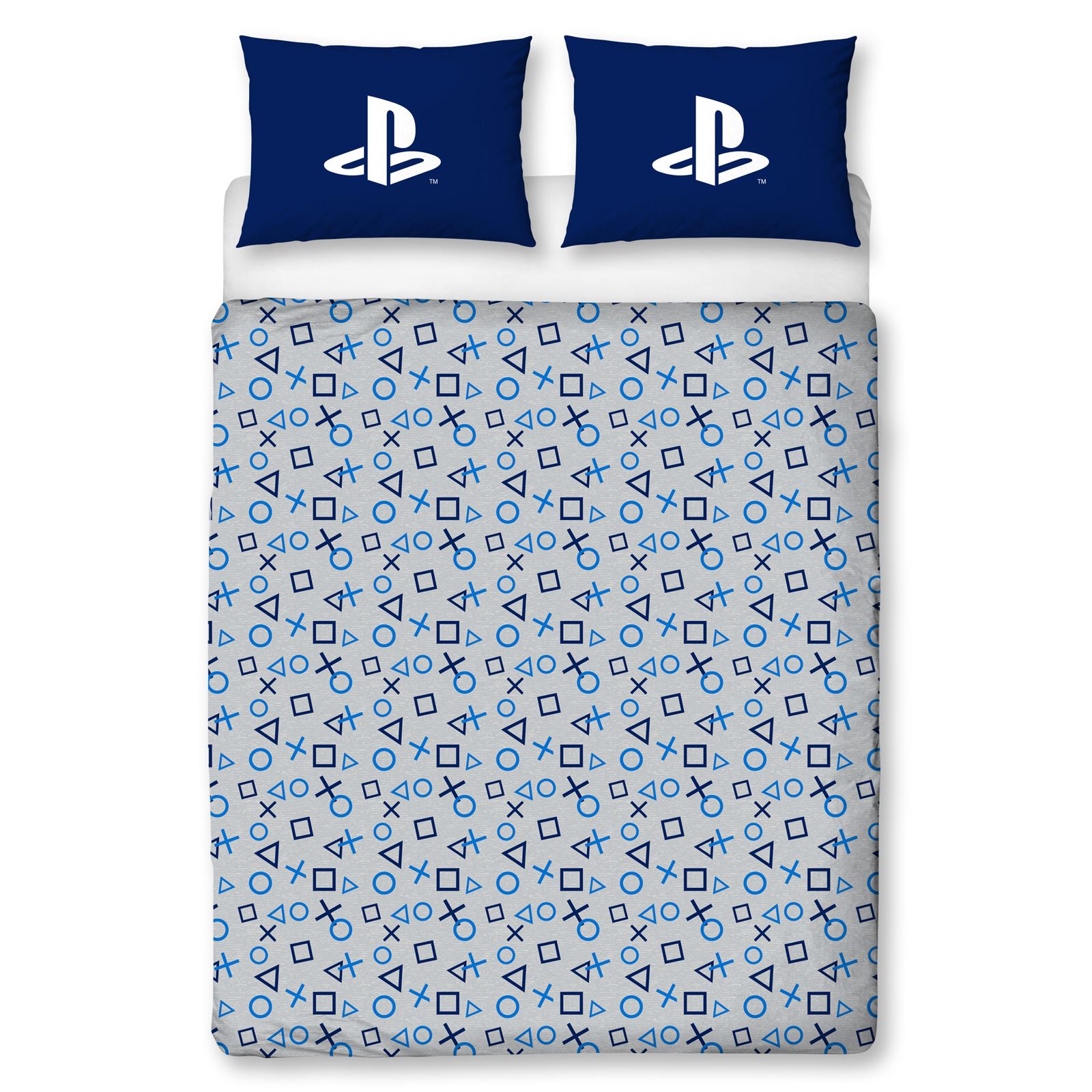 This official Playstation Blue double duvet cover set is ideal for gamers of all ages. The design features the iconic square, triangle, cross and circle controller symbols in an abstract pattern, in dark and light blue on a pale grey marl background, while the reverse has the icons in a smaller repeat pattern. Made from a polycotton blend, this bedding set is suitable for machine washing and can be tumble dried on a cool setting.