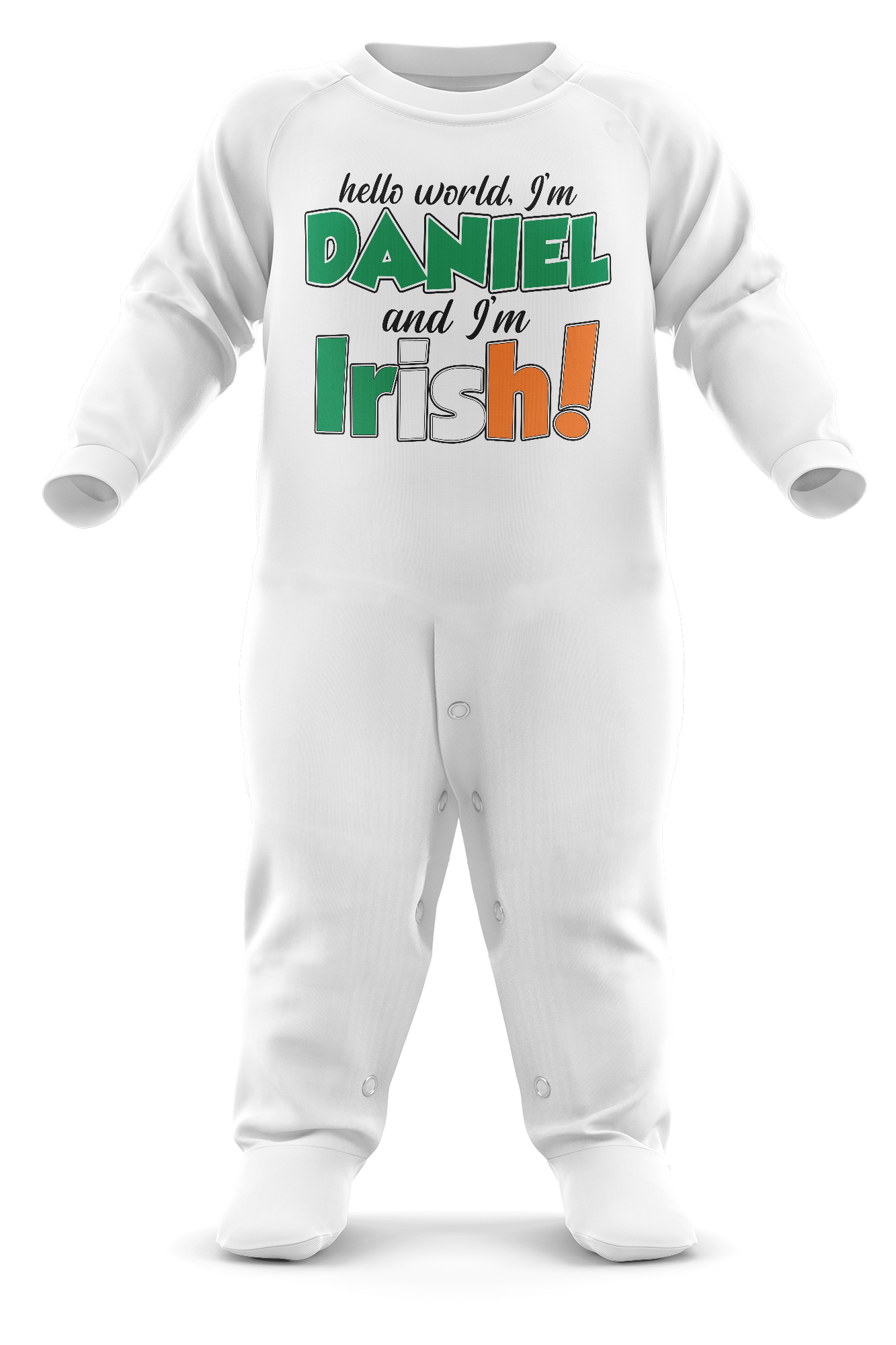 Featuring the phrase “Hello World I’m *YOUR NAME* And I’m Irish” in the colours of the Ireland flag printed on the front of the romper. Personalise with your babies name