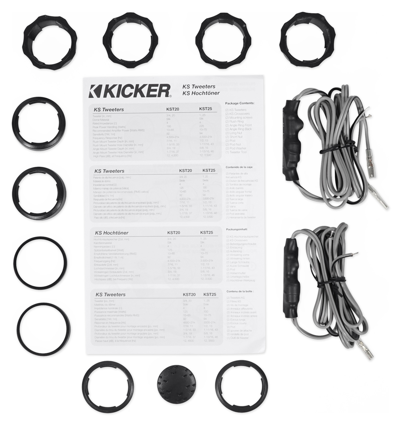 KICKER’s® elite KS tweeter upgrade has extended frequency range and high power handling, making it an excellent addition when you crave more volume and realism. KS-Series ¾-inch Tweeters use a silk dome to reproduce your music with incredible smoothness and accuracy. Comes complete with flush, angled and surface-pod mounting options and an in-line 12dB crossover. KS-Series Tweeters work best with 65 watts of recommended power.