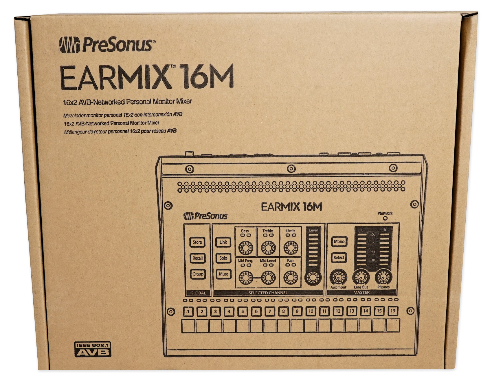 The EarMix™ 16M provides 16x2 mixing, with 16 mono channels of input from an AVB network; support for PoE power; 3-band EQ and limiter on all channels and the main mix; stereo channel linking; channel grouping; a loud, clear headphone amp that can handle low-impedance, in-ear monitors; 2 AVB Ethernet ports, enabling chaining units; network up to 24 units with a StudioLive Series III mixer.
