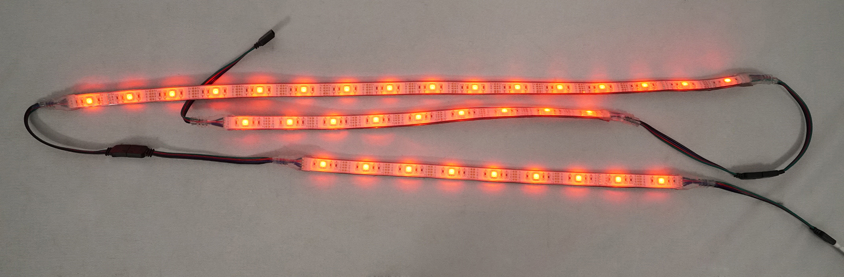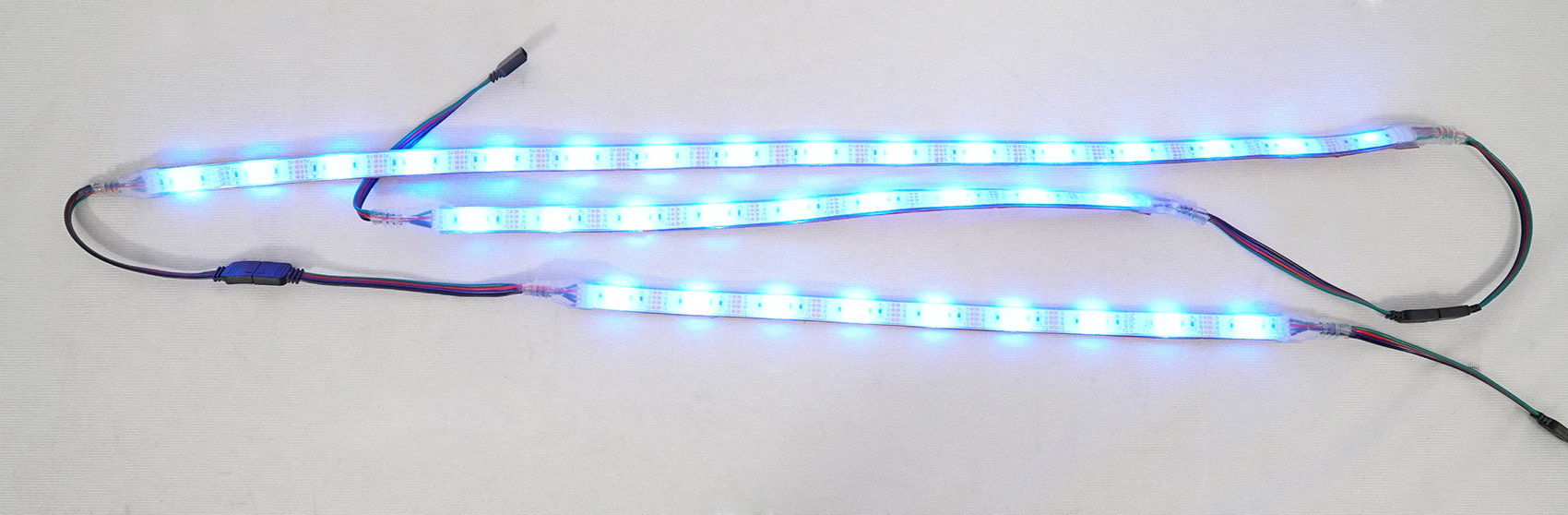1. We include 3 strips each the perfect length with the perfect cable length. Our top strip is twice as long. Ours is 26 inches (competitors are usually 12 to 15 inches). Ours is the perfect size for TVs ranging from 32 inches to 70 inches. At the end of each strip we have 7 inches of cable so you can plug one strip to the next without excessive amounts of wire all over the place. We intentionally include 3 strips, not 4. Trust me you do not want a strip on the bottom of your TV as I tested this and you will not be able to see the light because the TV blocks it. Also on most TVs there is no place to tape down the bottom strip where it is not in the way. You are better off with 3 strips that are each the proper size.