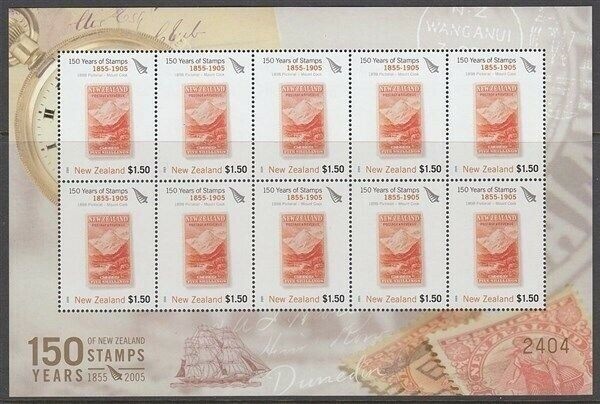 Special sheetlet of 10 values $1.50 features 5/- 1898 Mt Cook. Ex the "150 years of NZ stamps 1855/2005" Limited Edition Album (4000 produced). Very fine condition. Each sheetlet is individually numbered. Number may differ from that shown in scan.