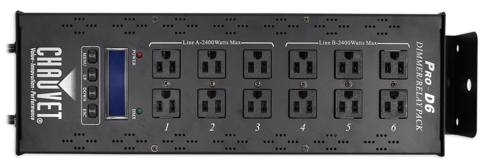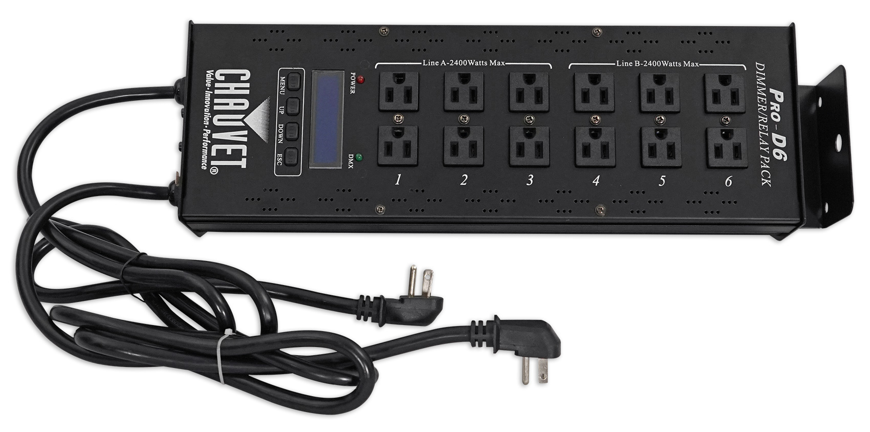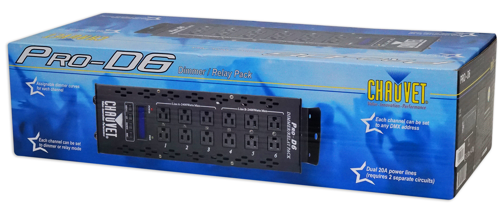 The Pro D6™ is a 6-channel DMX-512 dimmer/switch pack designed to work on multiple voltages (115V and 230V) simultaneously, and comes fitted with 20 amp connectors for this purpose. It offers variable electronic dimming and each channel can be set as either dimmer or relay.