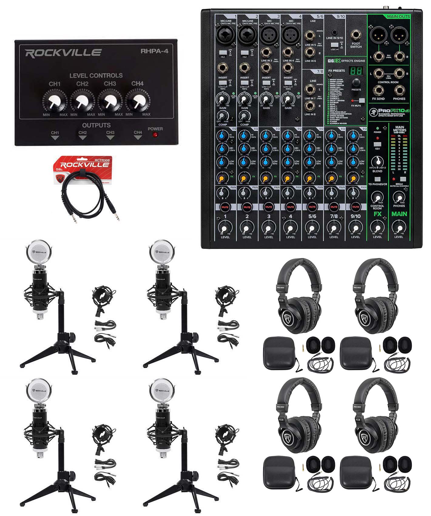 Package: Mackie ProFX10v3 10-Channel Professional Effects Mixer w/USB ProFX10 v3 + (2) Rockville RCM03 Pro Studio Recording Condenser Microphone Mic With High Quality Metal Construction and Shock Mount + (2) Rockville PRO-M50 Studio Headphones w/ Detachable Coil Cable, Case+Extra Ear Pad + (2) Rockville RDTS Adjustable Height Studio Desktop Tripod Microphone Stand and Mic Clip + Rockville RHPA4 4 Channel Professional Headphone Amplifier Stereo or Mono Amp + Rockville RCTR106B 6' 1/4'' TRS to 1/4'' TRS Balanced Cable, Black, 100% Copper