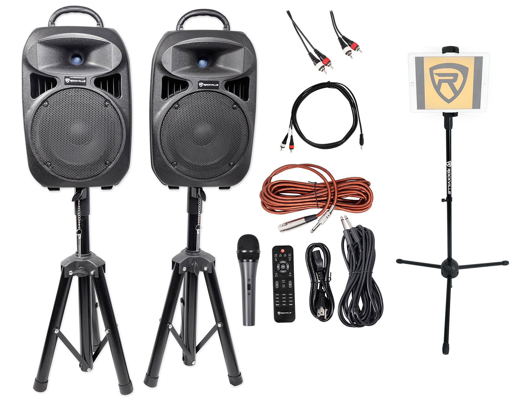 Package: Rockville RPG082K Dual 8" Powered PA System Speakers with Bluetooth, Microphone, Stands, and Cables + Rockville RNRMR10 10' Nickel-Plated 3.5mm 1/8" TRS to Dual RCA Cable with 100% Copper Conductors for Enhanced Signal Clarity + Rockville RCDR10B 10' Nickel-Plated Dual RCA to Dual RCA Cable - 100 % Copper Top Quality Cable! + Rockville iStand 20 Tablet/Smart Phone Tripod Stand-Fits iPhone iPad Galaxy+More