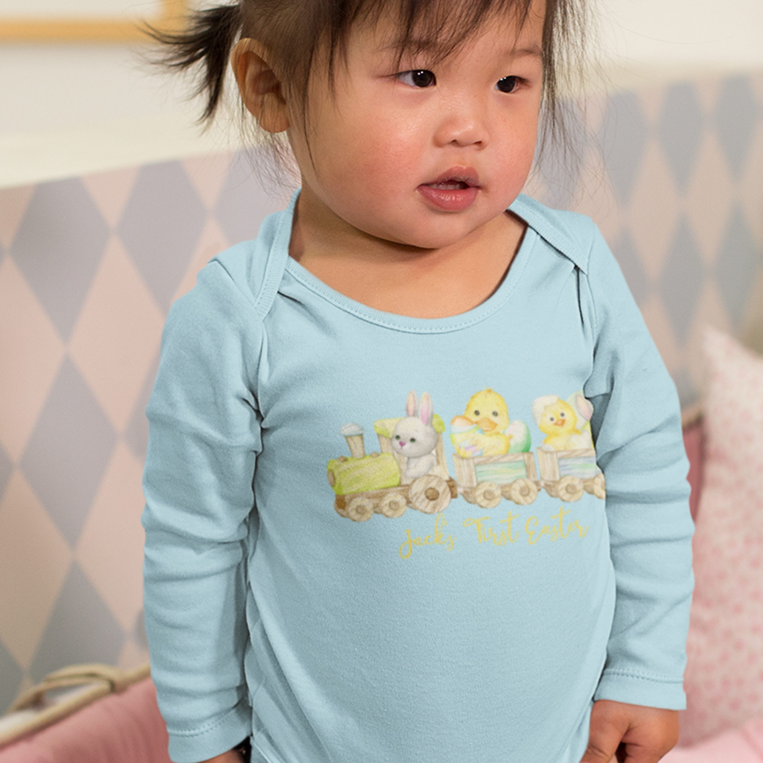 A fun baby outfit which reads custom name first easter featuring a novelty train with chicks and bunnies