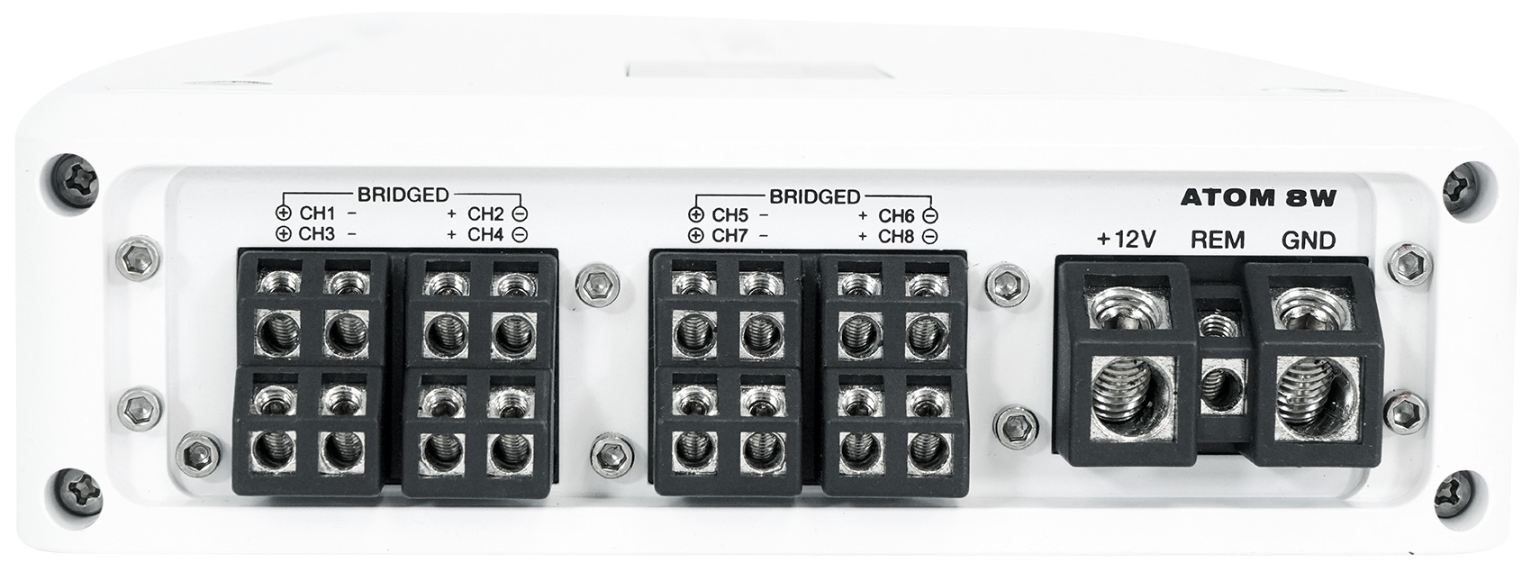 The ATOM 8W is a class D 8-Channel high power amplifier with 3,500 watts peak output and 880 watts RMS rated power. The power of this amplifier is the real deal! It is enough to power multiple zones all at high volumes that you can hear over engine and wind noise. The peak rating can be used to compare with brands who use peak ratings such as Boss and Power Acoustik while the Dyno Certified RMS rating can be used to compare with top brands such as Kicker, Rockford, Alpine, etc.
