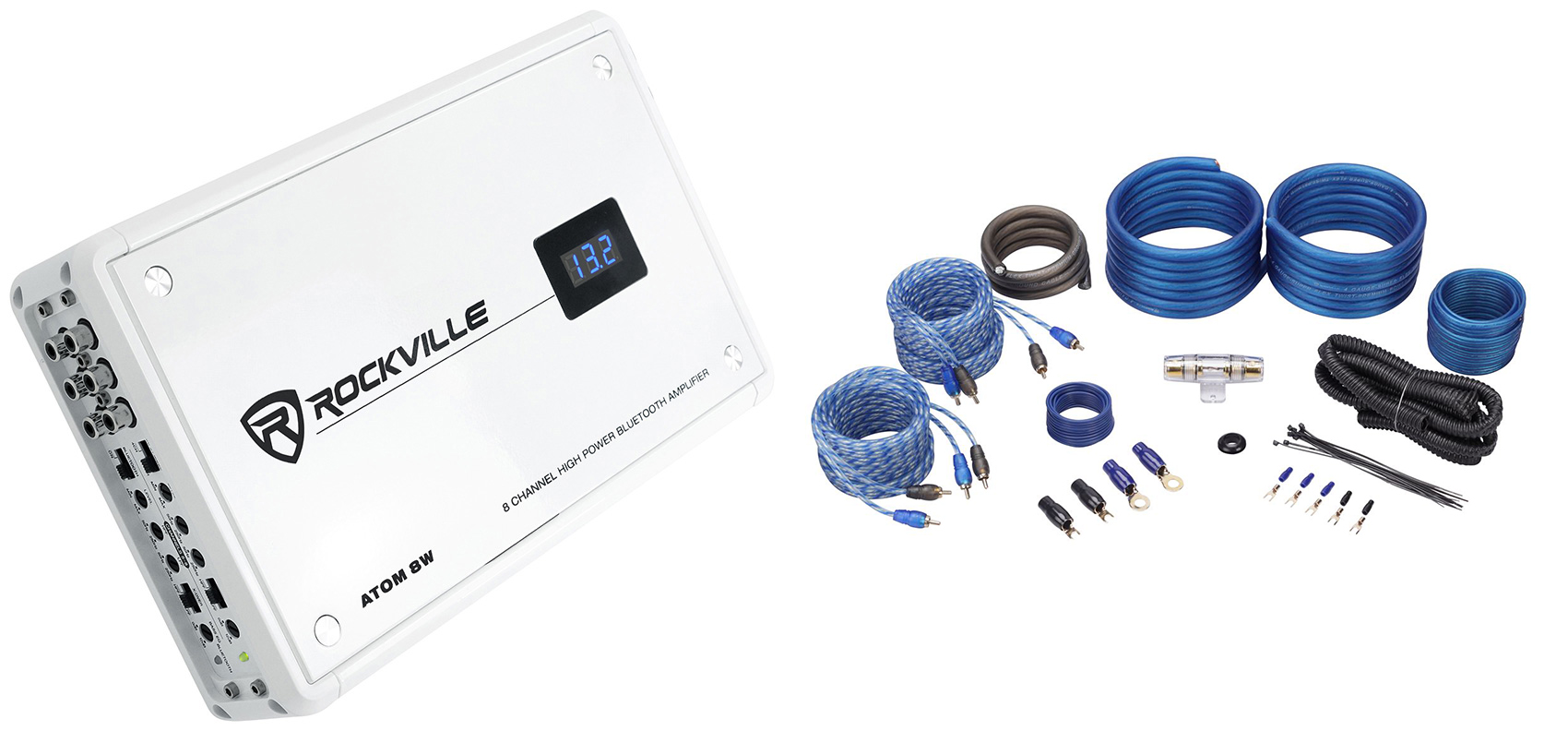 Package Includes: (1) Rockville ATOM 8W 8 Channel 3500 Watt Peak / 880w Dyno-Certified RMS Marine/Boat Amplifier Amp w/Bluetooth + (1) Rockville RWK42 4 Gauge 4 Channel Complete Car Amplifier Installation Kit With (2) Sets of 100% Pure Copper RCA Cables + (3) Rockville RTR172 17 Foot 2 Channel Twisted Pair RCA Cable Split Pin, 100% Copper