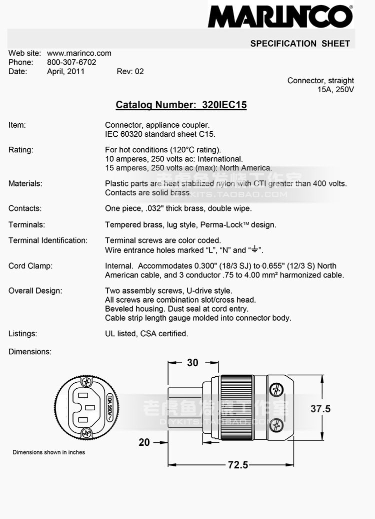 Brand: Marinco Place of Origin: Produced in the U.S., assembled in Mexico Model: 8215 320 Size: 38 mm * 51 mm Weight: 50g Power: 15A Condition: New Maximum wire diameter of inner hole: 3 x 4 square