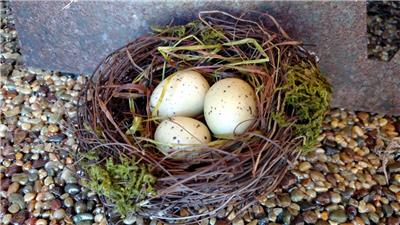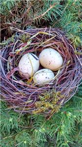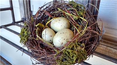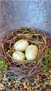 The nests are made of coiled and twisted straw and twigs. Each one is accented with a touch of rustic moss and have three eggs attached in the center. One egg is approx. 1-1/8" long and two are 1-5/8 long" .