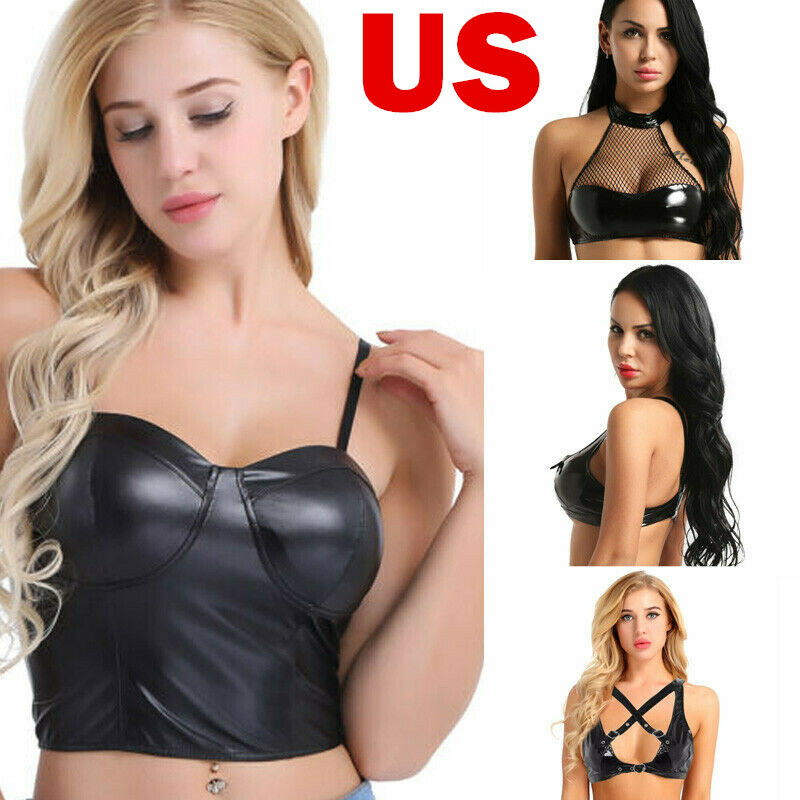 Women’s wet look patent leather bra top lingerie, wire-free and unlined design.