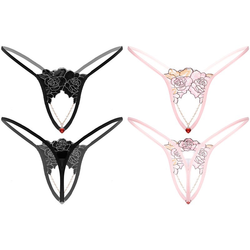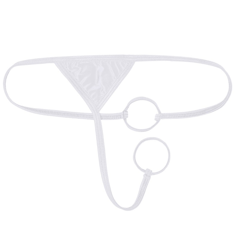 Low rise, crotchless, front with O-ring holes for a support, T-back.
