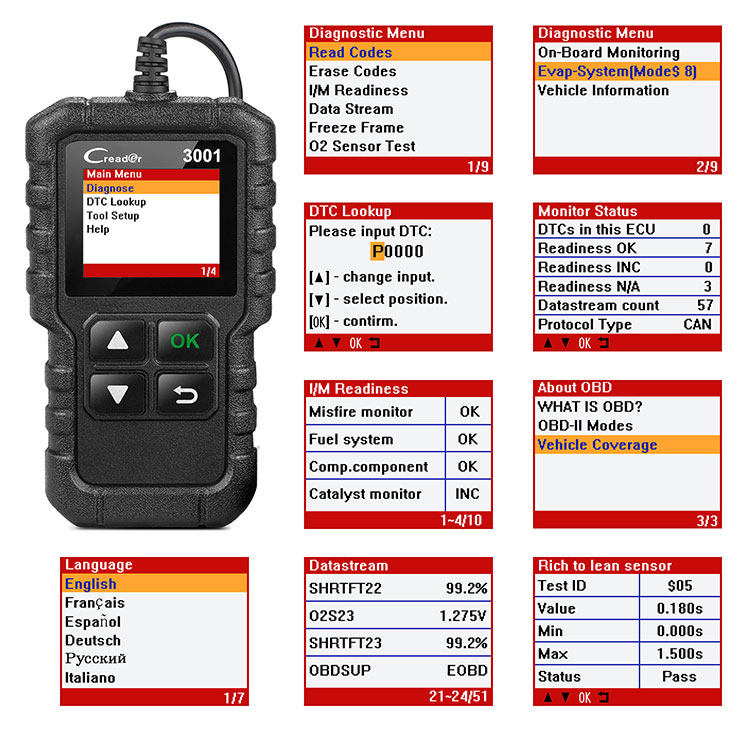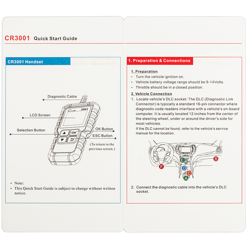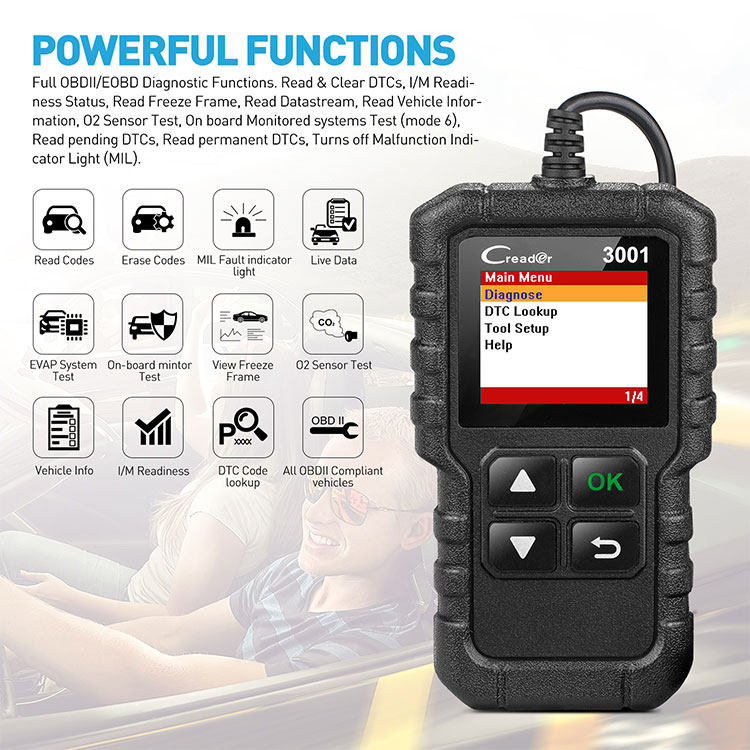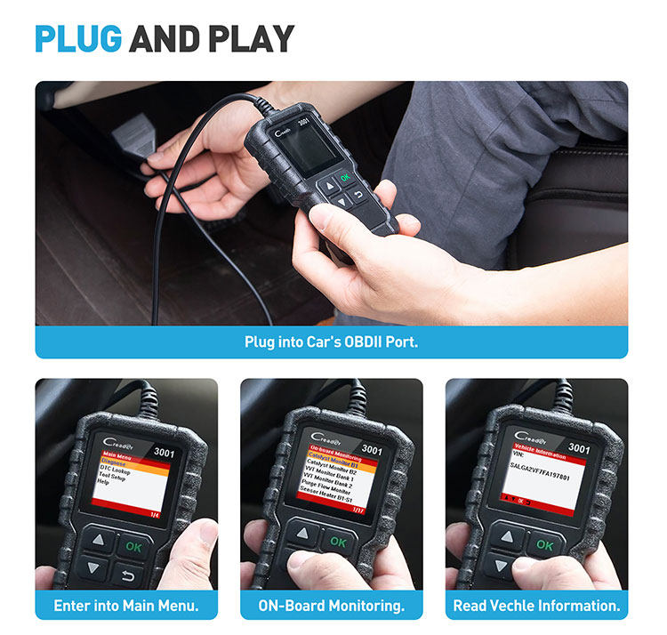 Product Introduction: CReader 3001 provides full OBDII/EOBD diagnostic functions and meets protocols such as ISO9141-2, ISO14230-4, SAEJ1850, and ISO15765-4.