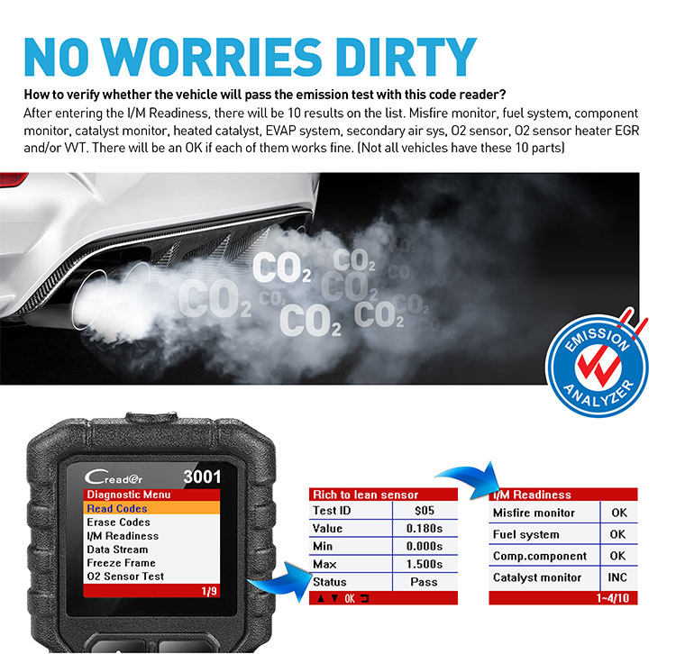 [ I/M Readiness Status Test] : You can use this obd2 scanner to check the status of emission-related monitors misfire system and fuel system, make sure the monitor was set before taking it to smog, help you pass the Smog Check easily, save your money for paying fine tickets.