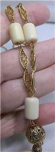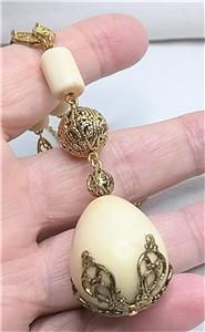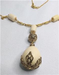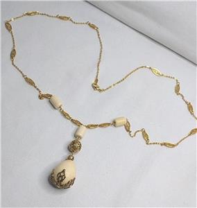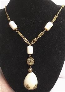 This is marked AVON C I, Long chain with gold toned stations and embellished with two faux ivory tube shaped beads and the drop has another of these tube shaped beads plus a big chunky teardrop with a filigree cap. This is perfect for wearing with your winter whites or cute with even your most casual jeans look. Great item for work or church. See pictures. Lobster claw clasp.